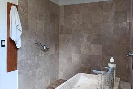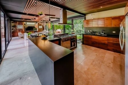 La cocina, que puede estar abierta o cerrada, esta completamente equipada de lujo con meseta de granito y carpintería con herrajes Blum. Se cuenta con una alacena amplia y cerca de esta área de servicios se encuentra el área de lavado y cuarto de servicio. El garage techado es para 4 vehículos y cuenta con portón eléctrico para mayor privacidad.