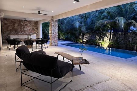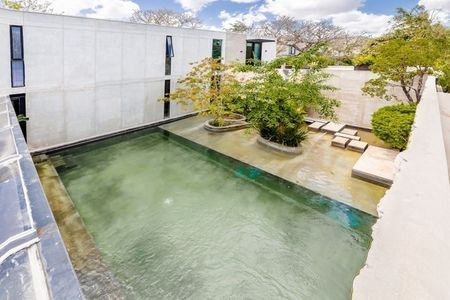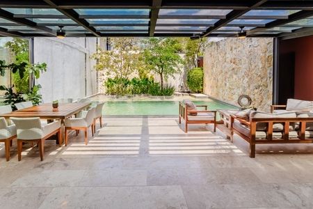 Al salir a la terraza vemos un área de bar muy cómoda y la alberca que de noche brilla con unos destellos del mosaico veneciano. Esta área cuenta con un medio baño de visitas.
