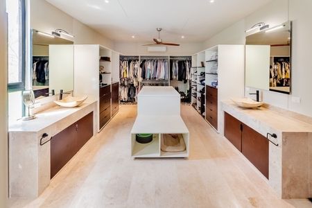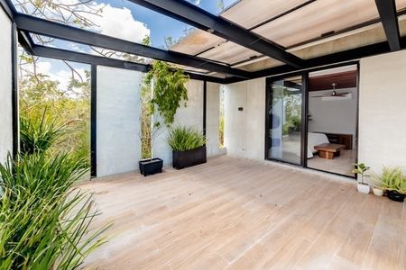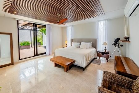 Un family room da entrada al área de las recámaras donde dos recámaras secundarias con baño propio y clósets vestidor tienen vista directa a la alberca y una recamara principal amplia con jardín interior, closet vestidor y baño con doble lavabo también cuenta con una linda vista al jardin de la casa con diseño de paisajismo. Además esta casa cuenta con un estudio que puede funcionar perfectamente como oficina.