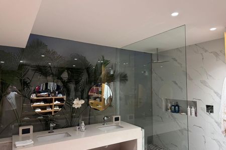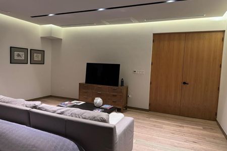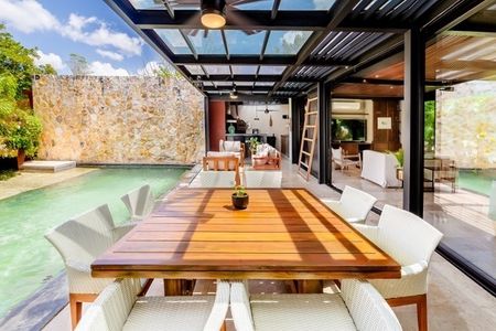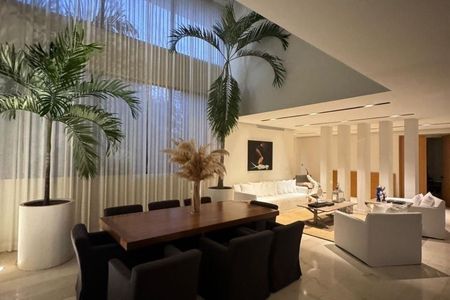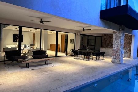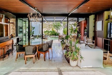 Al entrar un pasillo muy iluminado te integra con el área de sala y comedor a doble altura con un mueble empotrado diseñado para enmarcar este espacio. Esta zona tiene unos ventanales amplios que dejan entrar luz natural y al mismo tiempo te proporciona vistas hacia el área de bar y alberca.