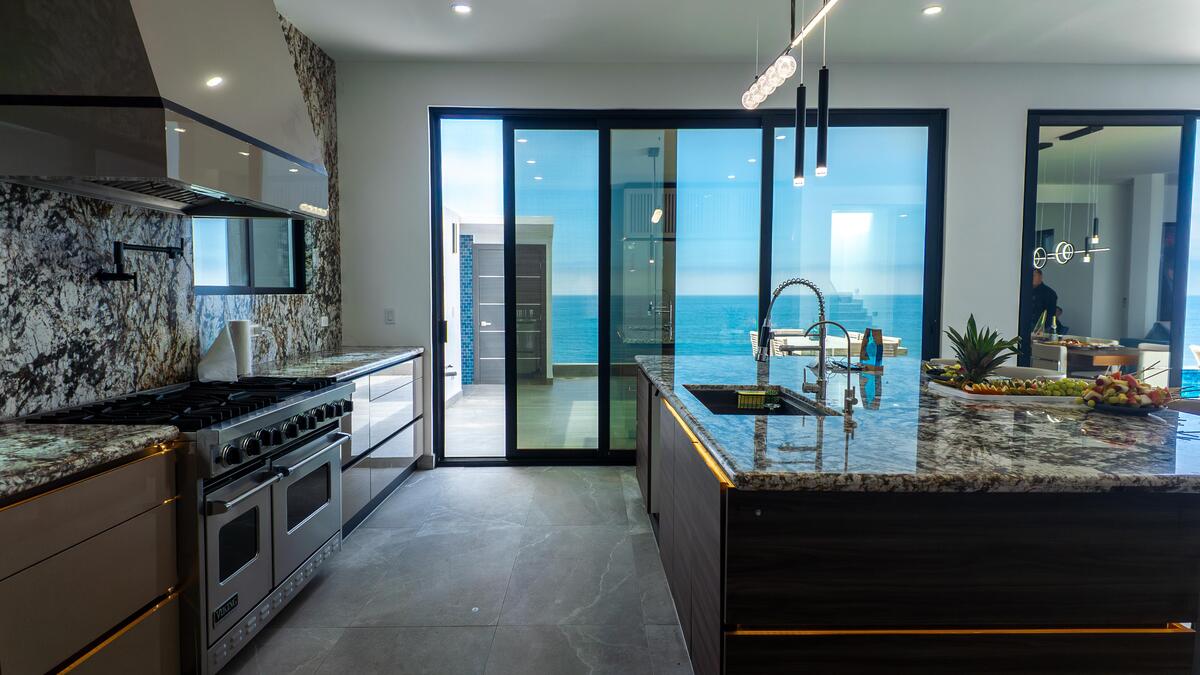 entering the house. The first floor opens out to your outdoor kitchen, infinity-edge pool with jacuzzi,