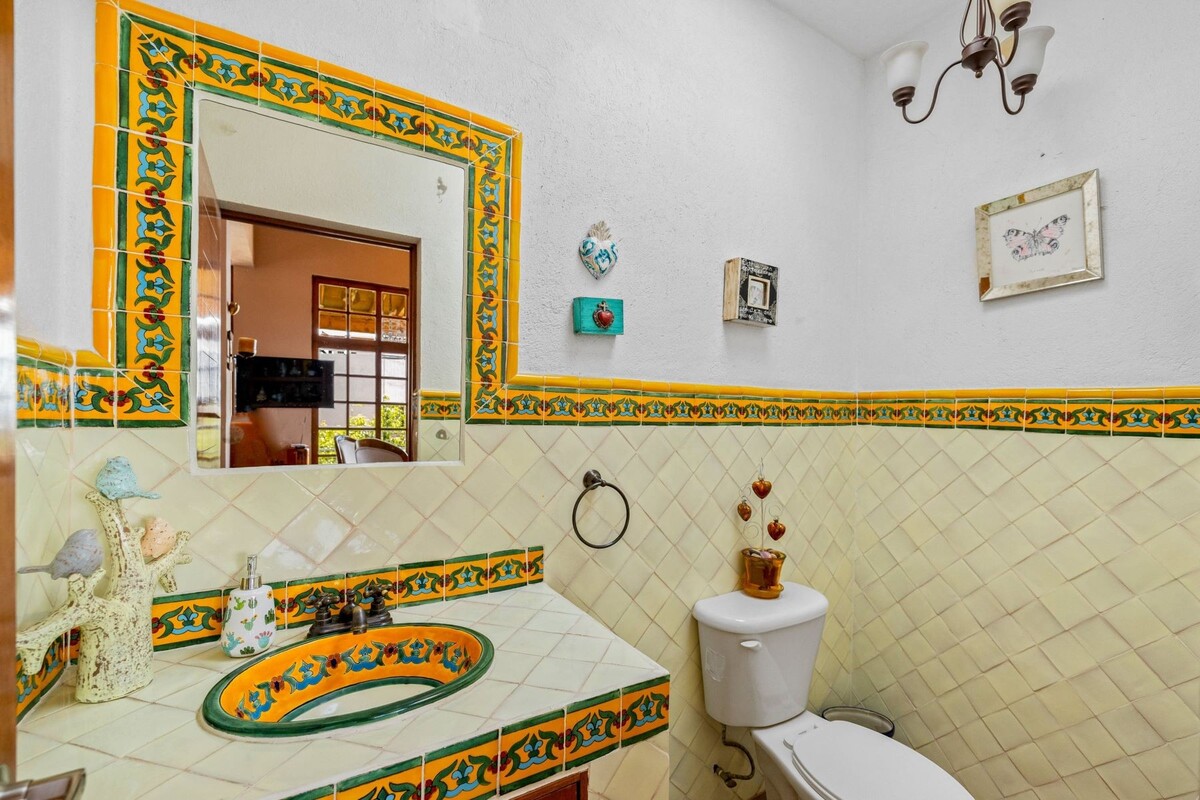 The kitchen, featuring traditional green tiled countertops and ample cabinetry, is ready to support your culinary endeavors. Bathrooms are functionally designed, some showcasing classic Mexican tilework. Throughout various living areas, the home features charming details like exposed wooden beams and tile flooring, contributing to its authentic character.