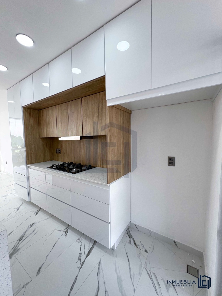 -Moderna cocina integral con barra de cuarzo, parrilla y campana