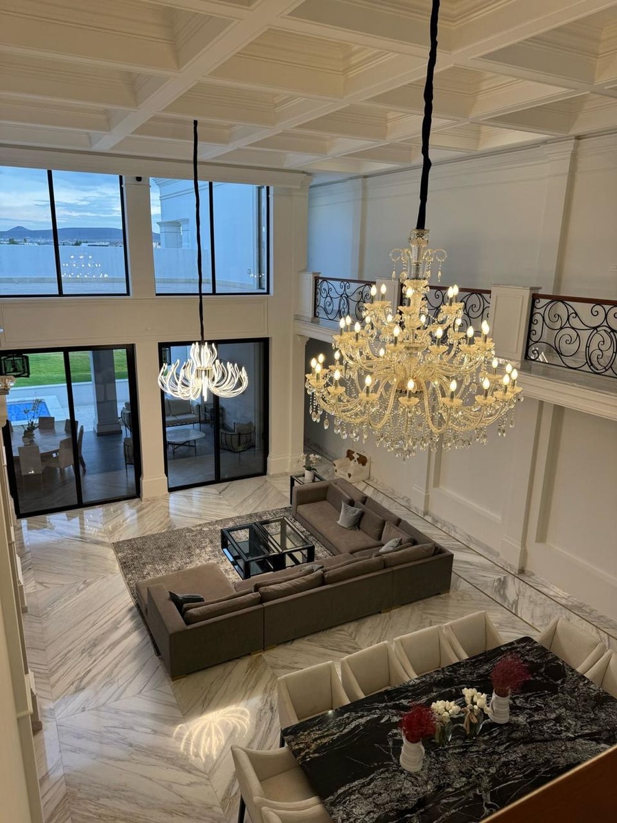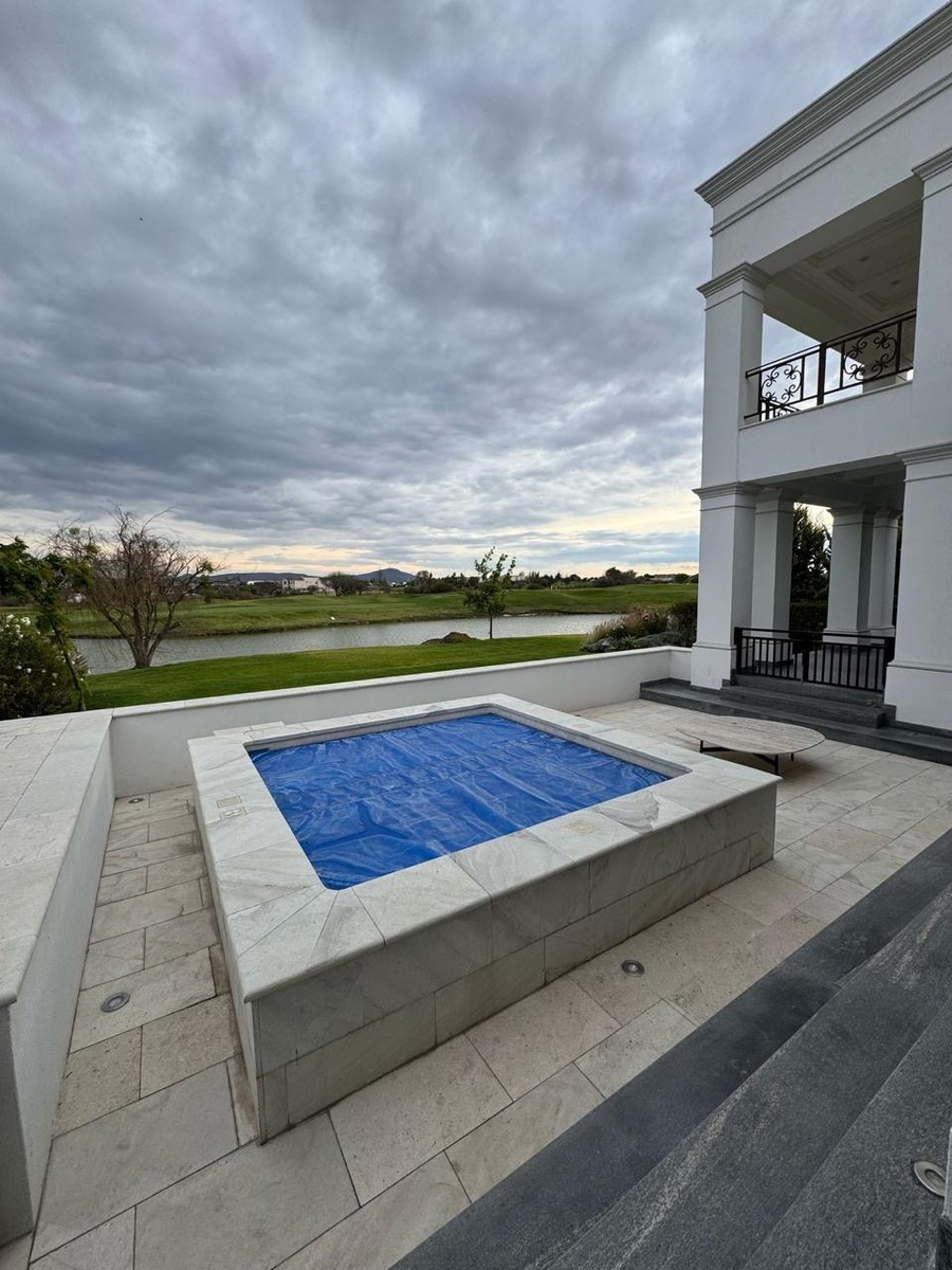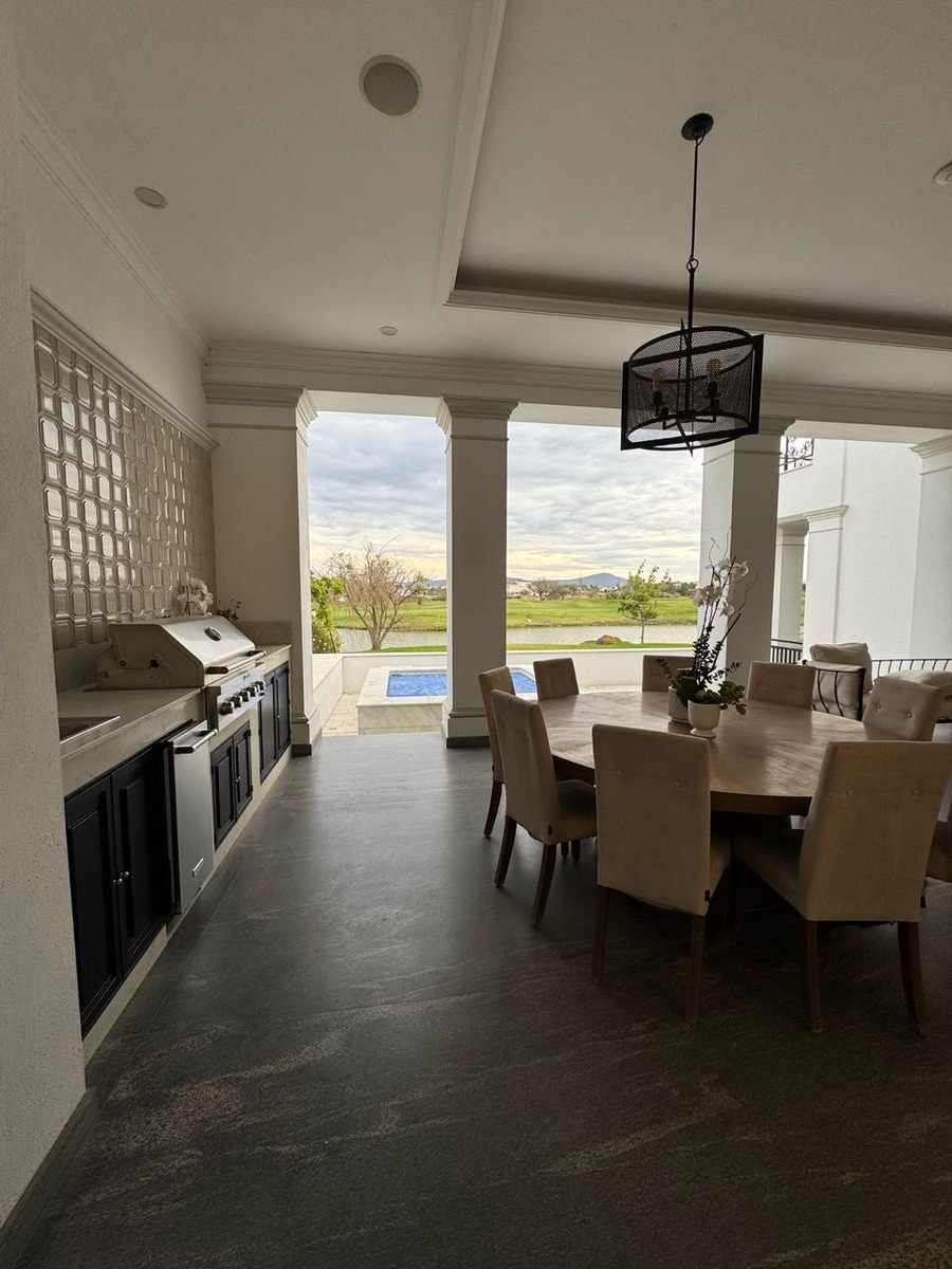 Sala comedor a doble altura con preciosas vistas al campo de golf que se une a una amplia terraza súper equipada con asador, fábrica de hielos, entre otras cosas, además de un jacuzzi para 8 personas.