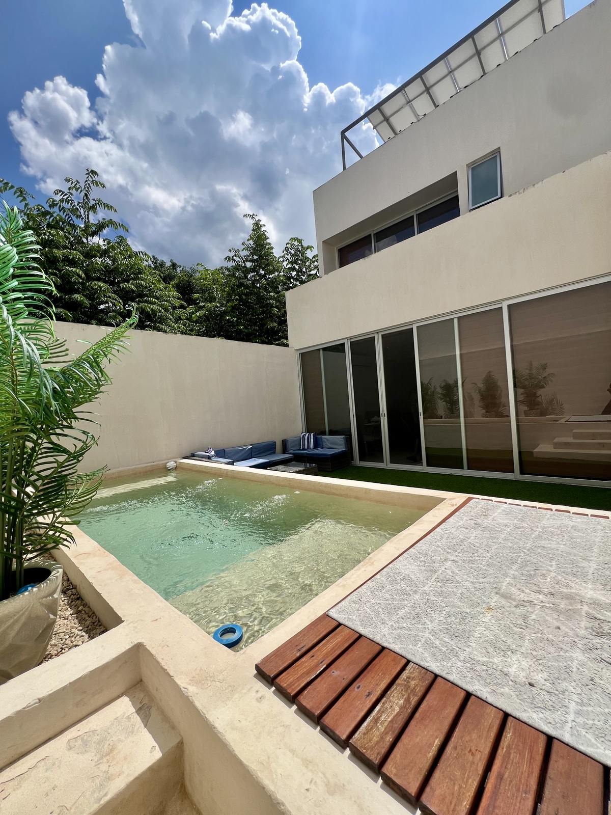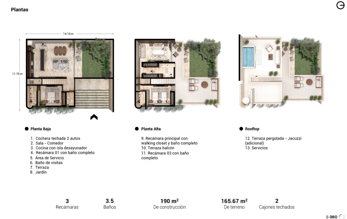 Distribución PB: - cochera techada para dos autos - sala comedor - cocina con isla - baño de visitas - recámara con baño completo y clóset - área de servicio - terraza - jardín con piscina