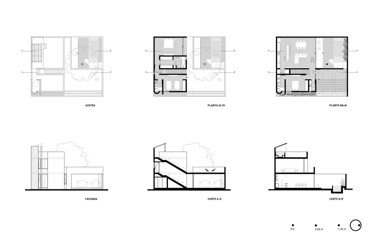Distribution GF: - covered garage for two cars - living-dining room - kitchen with island - guest bathroom - bedroom with full bathroom and closet - service area - terrace - garden with pool