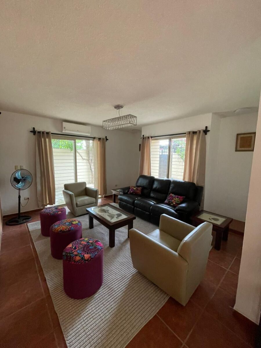 Sala con aire acondicionado, ventilador, cortinas y juego de sala completo