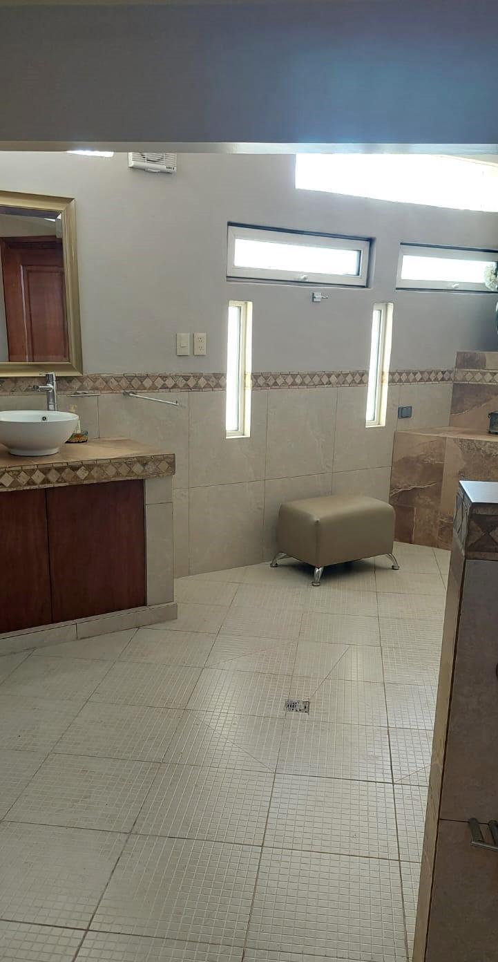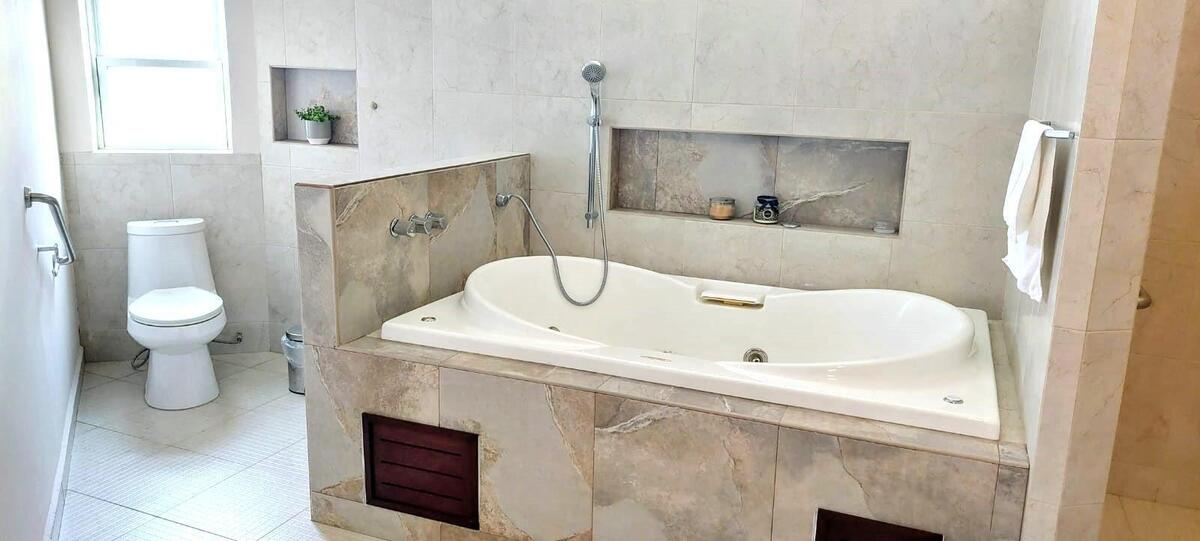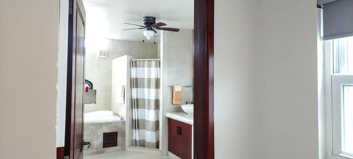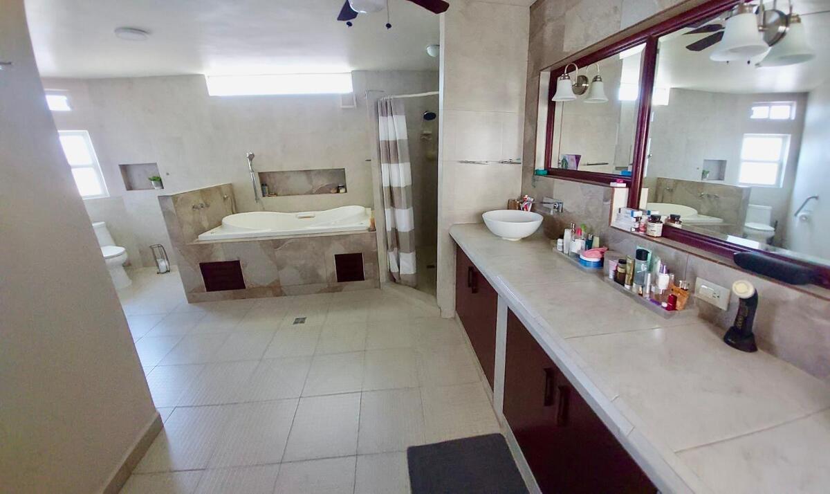 Recámara con minisplit y abanico de techo, cuarto vestidor y closet para blancos, baño muy grande con videt y preparación para instalar jacuzzi