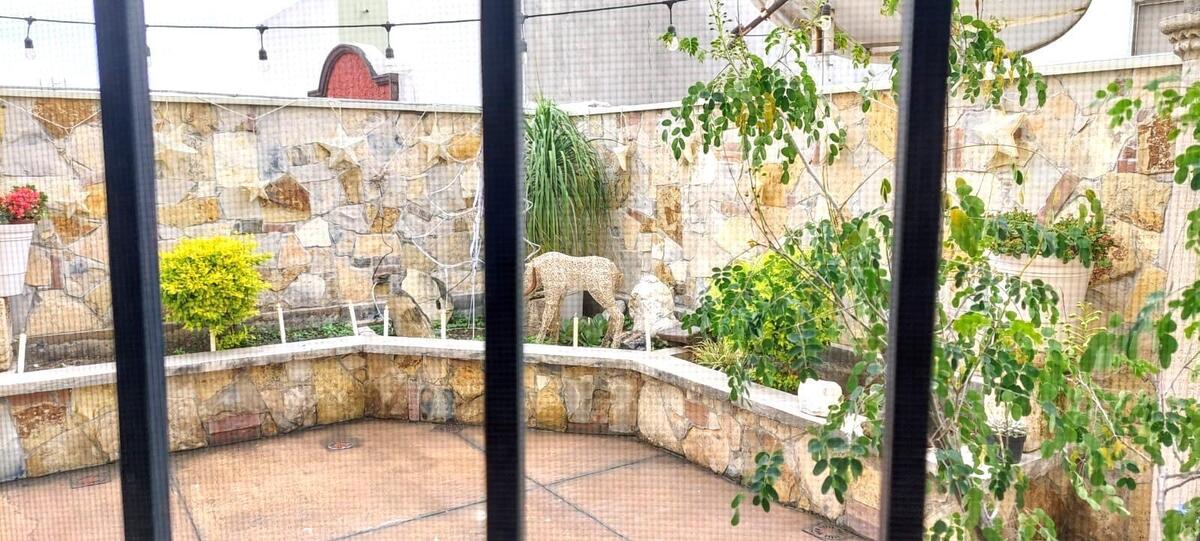 Cochera techada para dos carros con portón eléctrico y jardineras