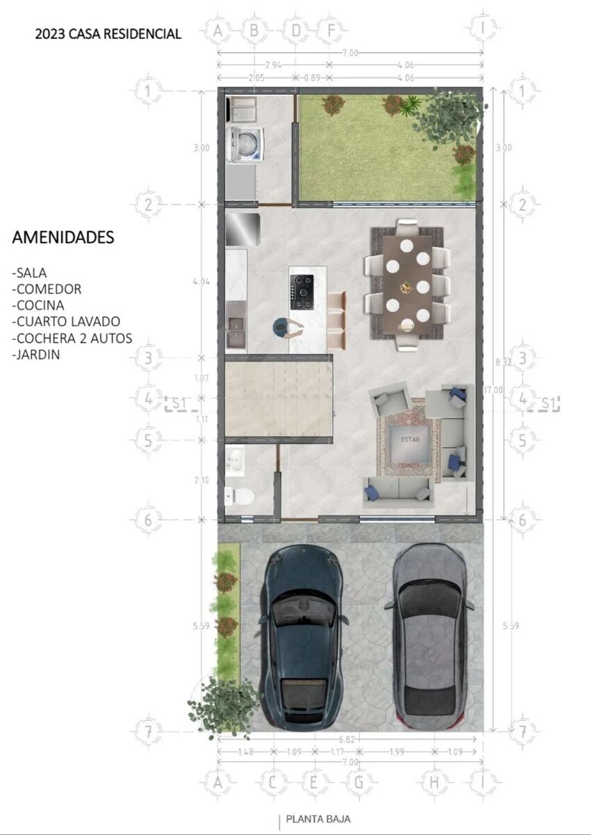 Cochera para 2 autos, Sala, comedor, medio baño, cocina integral, jardín, cuarto de lavado.