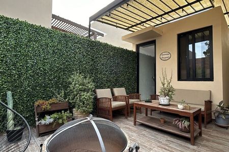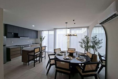 Estacionamiento para dos autos, sala, estudio o cuarta recamara con baño completo, Comedor, cocina integral con barra de cuarzo blanco, área de lavado techada, jardín.