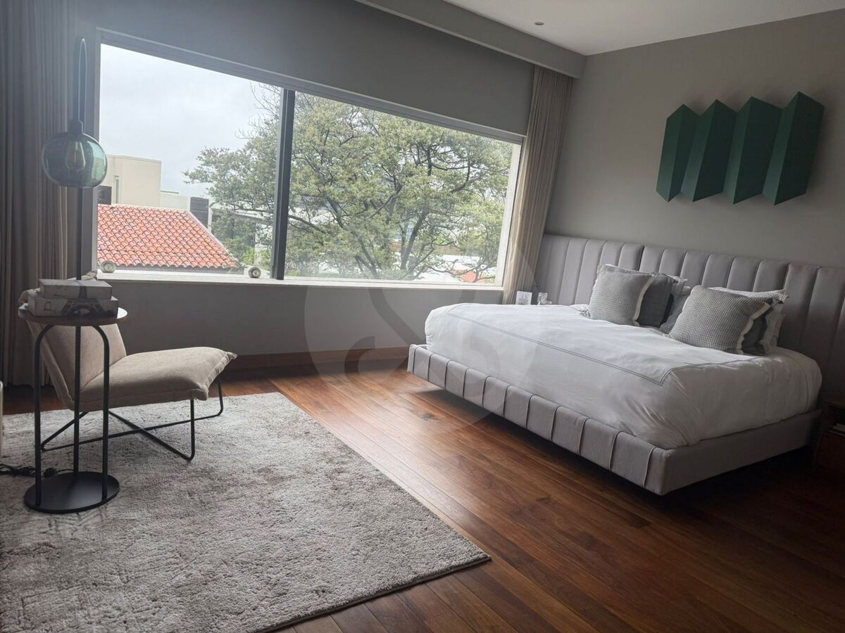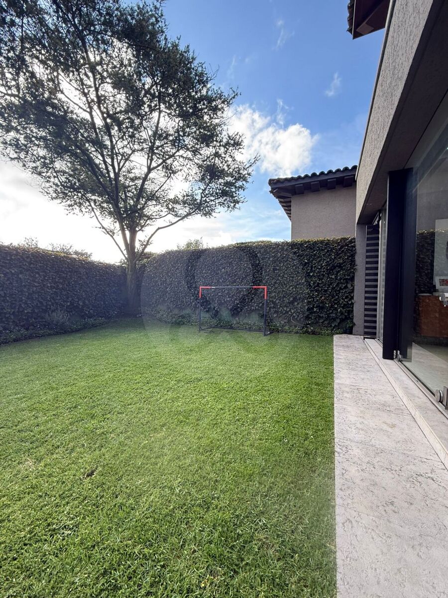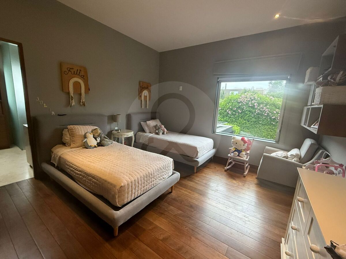 En la misma planta se encuentra sala, comedor, una cocina muy amplia que tiene acceso directo al cuarto de lavado, cuarto de servicio y patio. Tanto el comedor como la sala tienen acceso al jardín (de 100 mts ) y a la terraza con un asador de excelente calidad. En la planta alta se encuentran 4 recámaras dos de ellas tienen clóset y comparten un baño muy amplio con doble regadera y este tiene más espacio de clóset; las otras dos recámaras con vista la jardín tienen baño propio con walking clóset y un family de muy buen tamaño que vestíbula las recámaras.