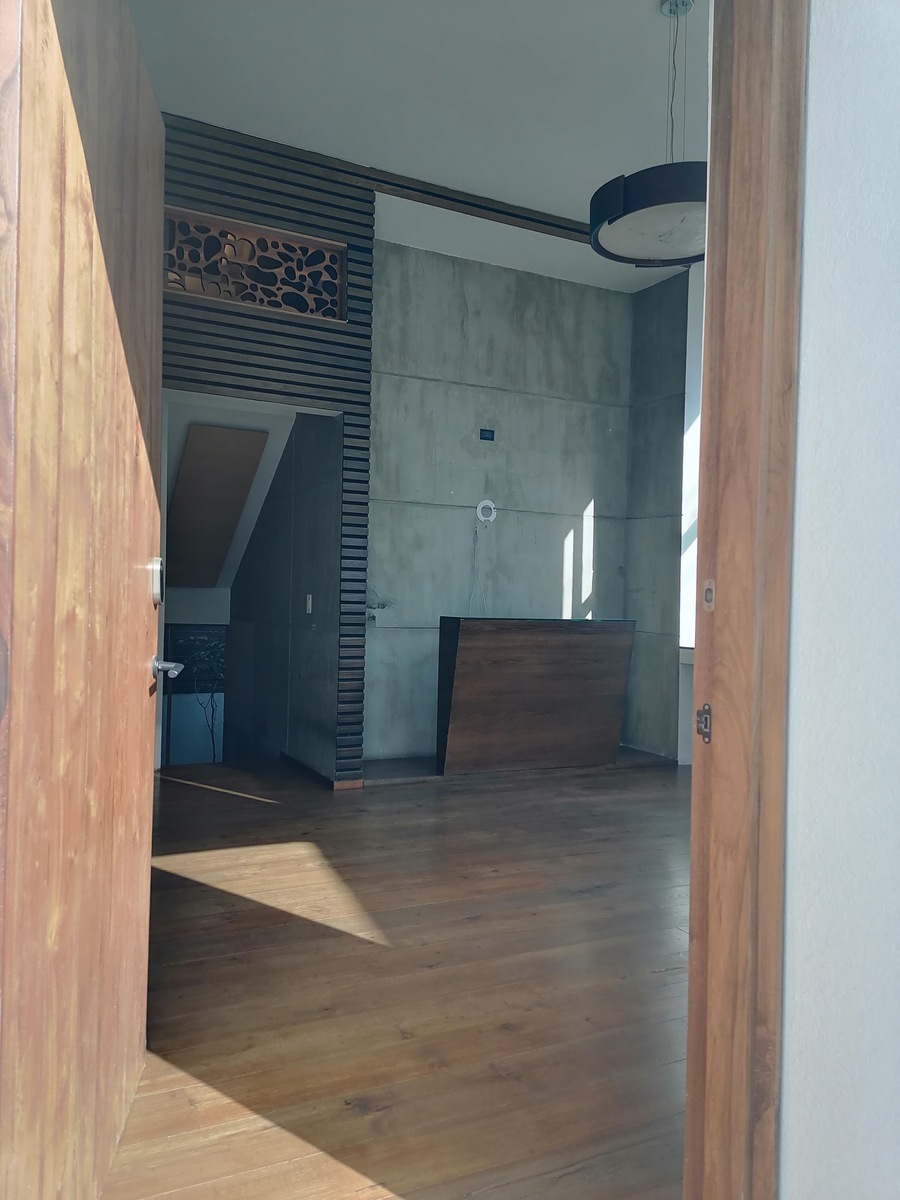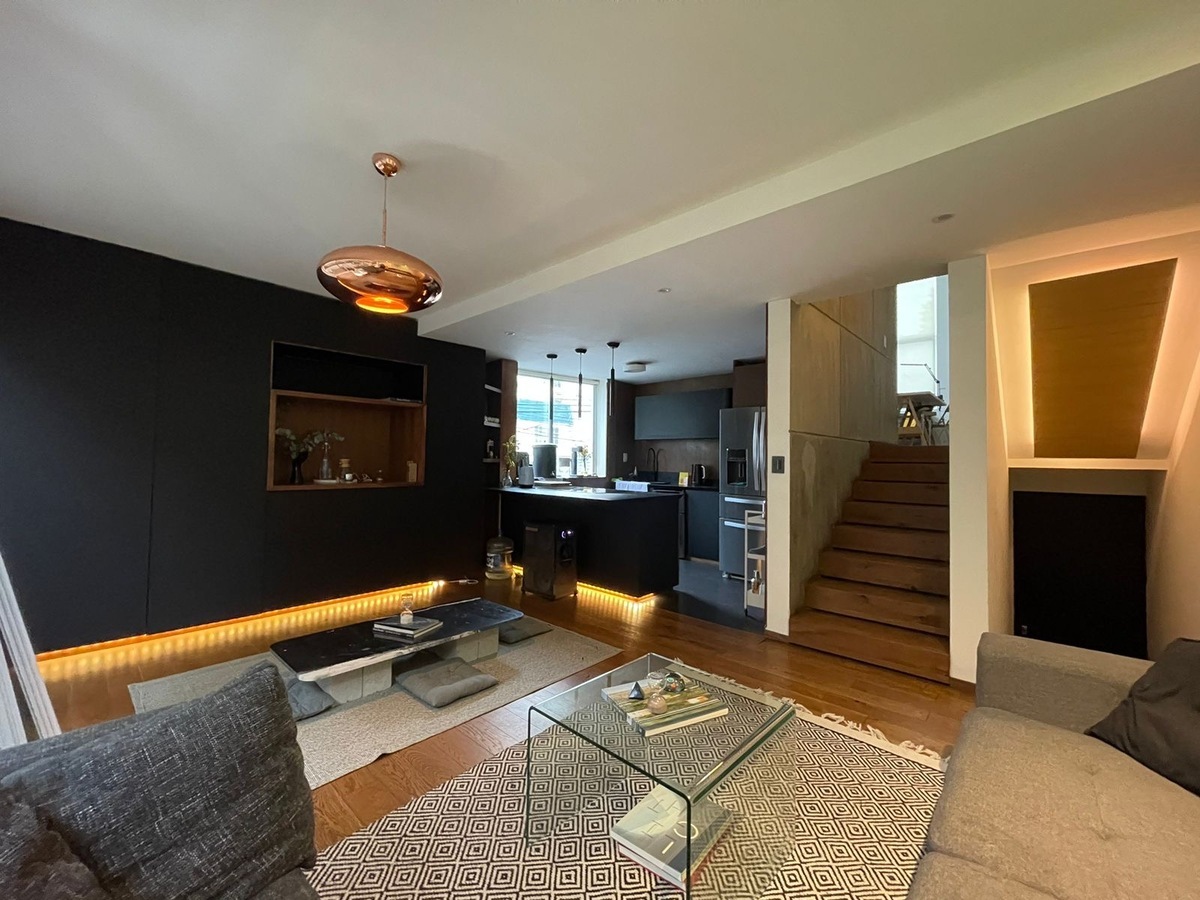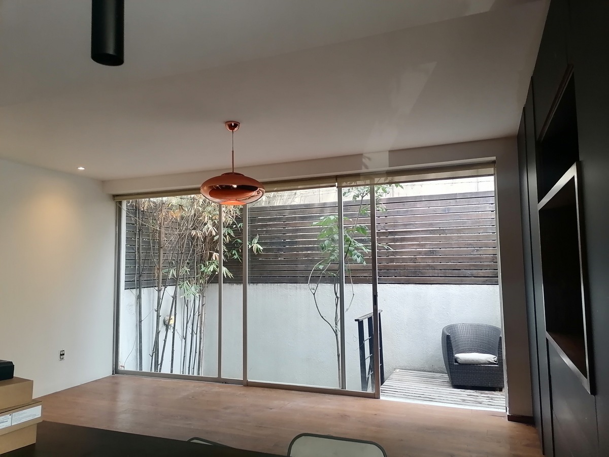 Los ambientes se encuentran distribuidos en medios pisos. La sala cuenta con techos de doble altura y la cocina es minimalista y tiene pequeña terraza o patio.