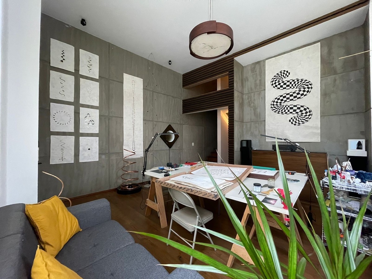 The spaces are distributed over half floors. The living room has double-height ceilings and the kitchen is minimalist with a small terrace or patio.
