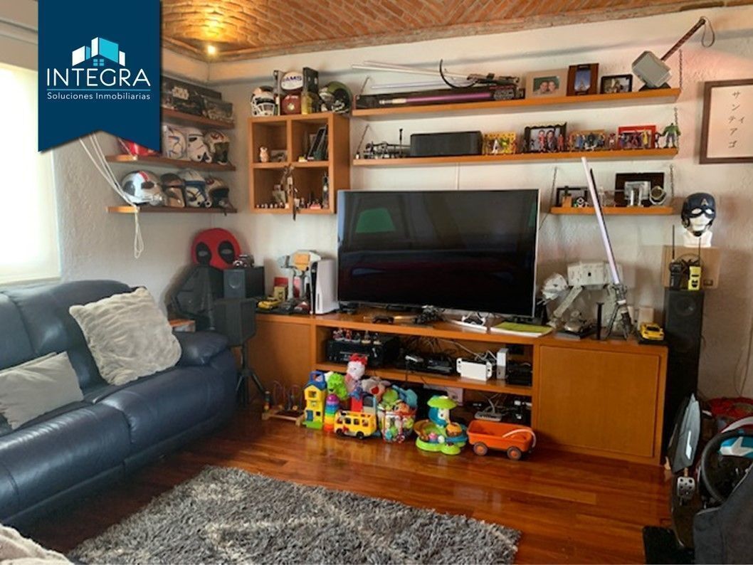 El nivel 1 consta de medio baño de visitas, sala con chimenea, bar, comedor, cocina integral y jardín con asador. El nivel 2 consta de 3 recamaras, las secundarias cada una con baño y closet con salida a una terraza y la principal con sala de televisión integrada, enorme vestidor, baño y sauna. En el tercer nivel hay una oficina, un enorme cuarto de televisión con bóveda catalana, bar, medio baño y otra agradable terraza. La casa tiene uso exclusivo de un jardín de unos 500 metros con garaje adicional.