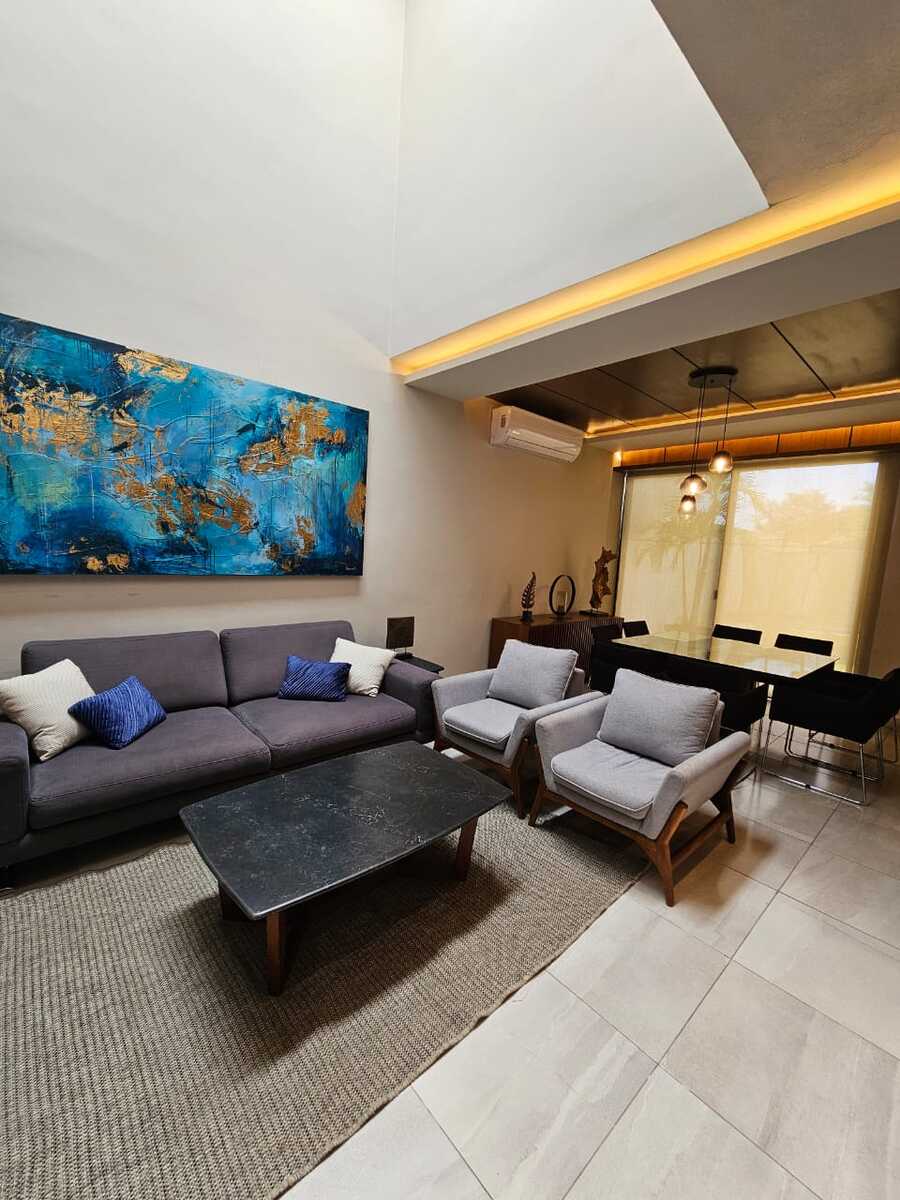 El proyecto se conforma con cochera para dos vehículos, espacios abiertos de sala a doble altura – comedor – cocina y 3 habitaciones cada una con su propio baño, adicional al área de lavado y piscina con jardín trasero.