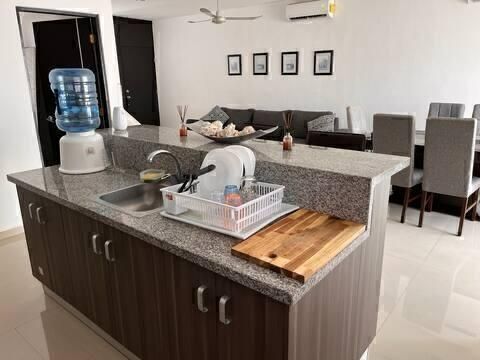 - Cocina equipada con estufa de gas, refrigerador, microondas