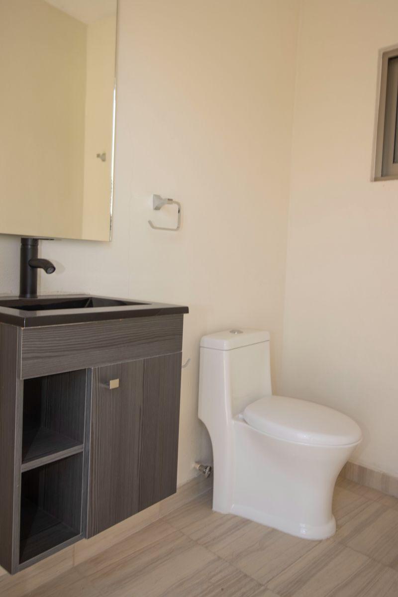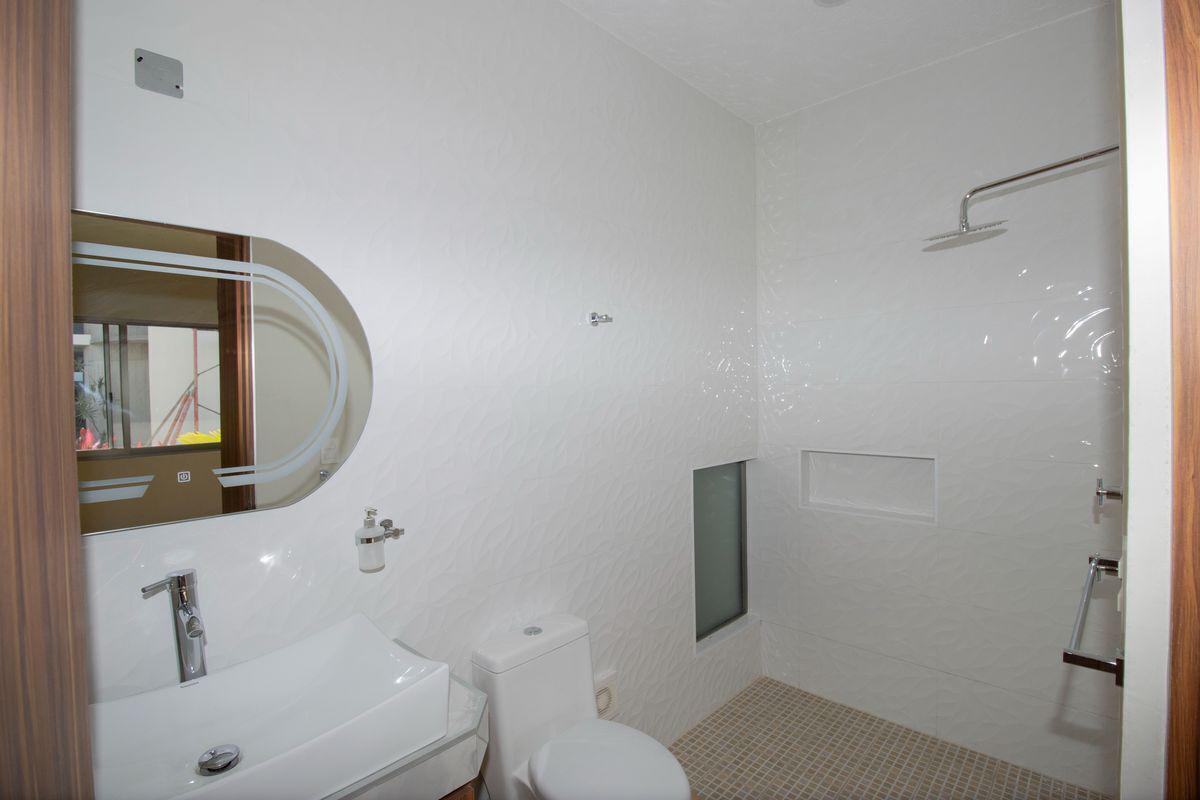 Baños con sanitario de doble descarga, lavabos modernos y espejos iluminados.