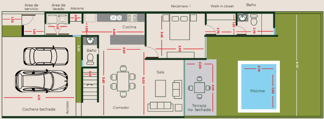 • Piscina es de 2.70 metros por 3.80 metros y 1.40 metros de profundidad.