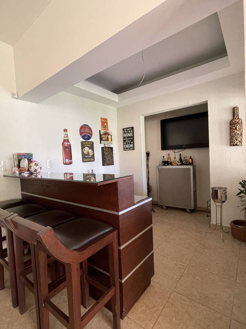 La sala y el comedor con vista al jardín, cuenta con un bar que da servicio al área de la sala y la terraza.