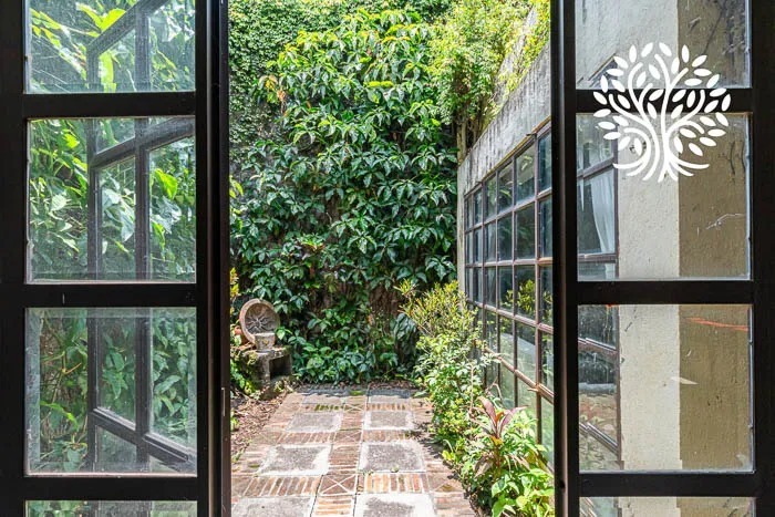 Jardín: estilo patio, laurel de la India maduro, vegetación abundante