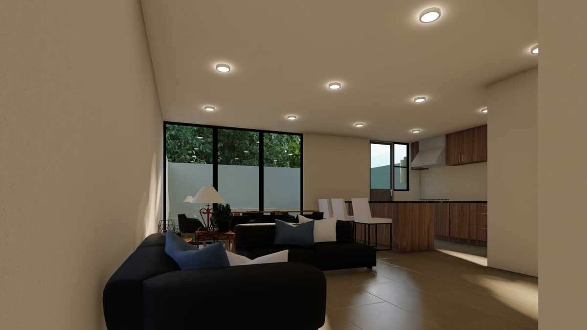 Planta baja: sala, comedor, cocina, recámara/estudio con baño completo, cochera para 2 autos, patio trasero.