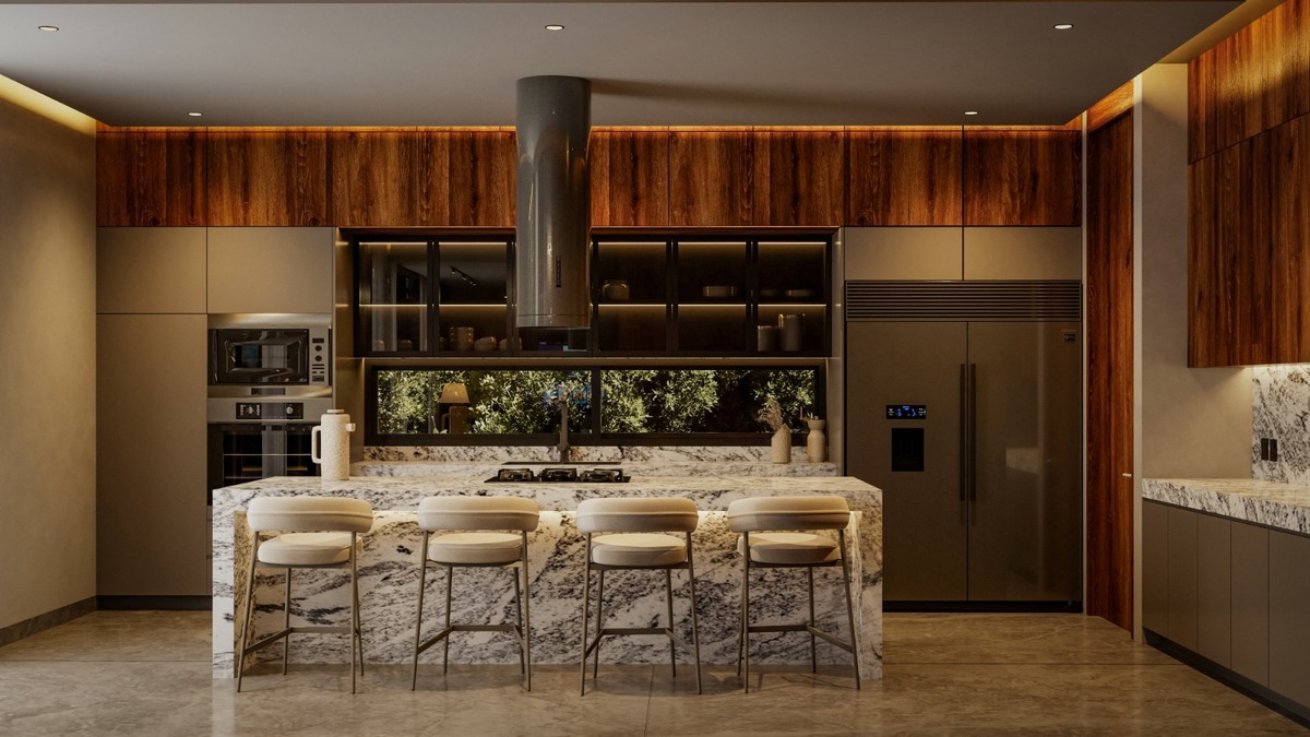 - Cocina integral equipada con campana, parrilla y hornos marca Teka o similar