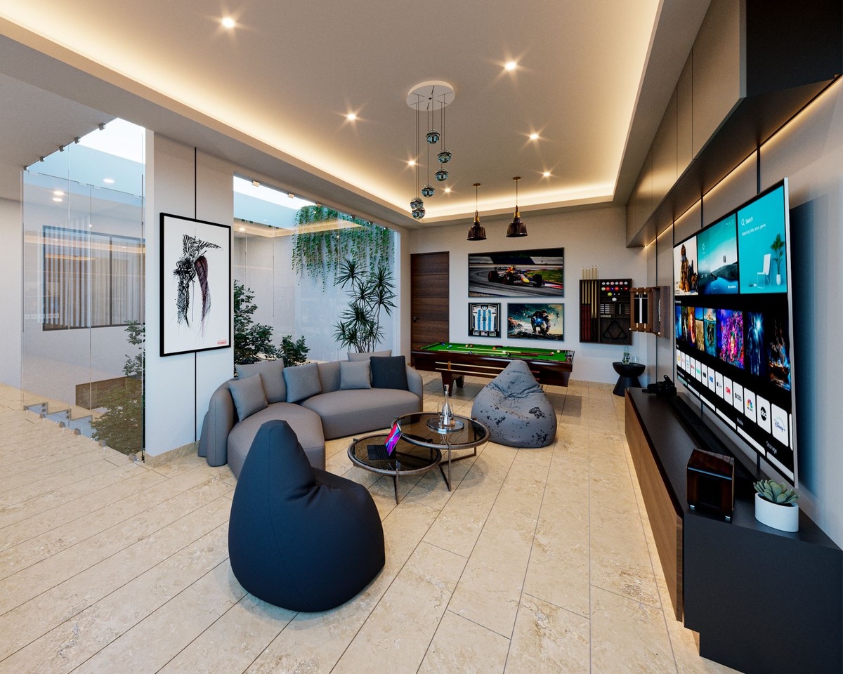 • Sala de TV con barandal de cristal templado y hermosa vista a jardín interior.