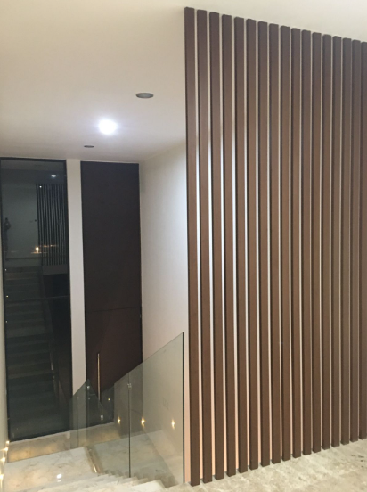 ● Fachadas con mármol, chapa de piedra natural y aluminio color madera.