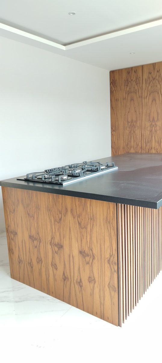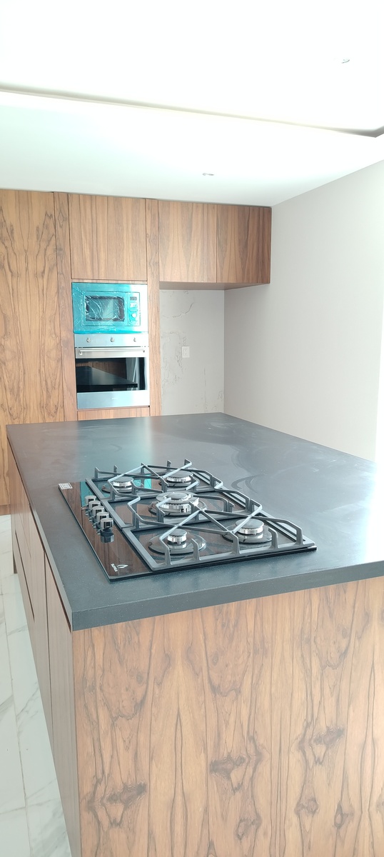 -Cocina cerrada de diseño moderno y funcional, equipada con horno, microondas y una elegante isla central de granito, con carpintería fija en tono nogal.