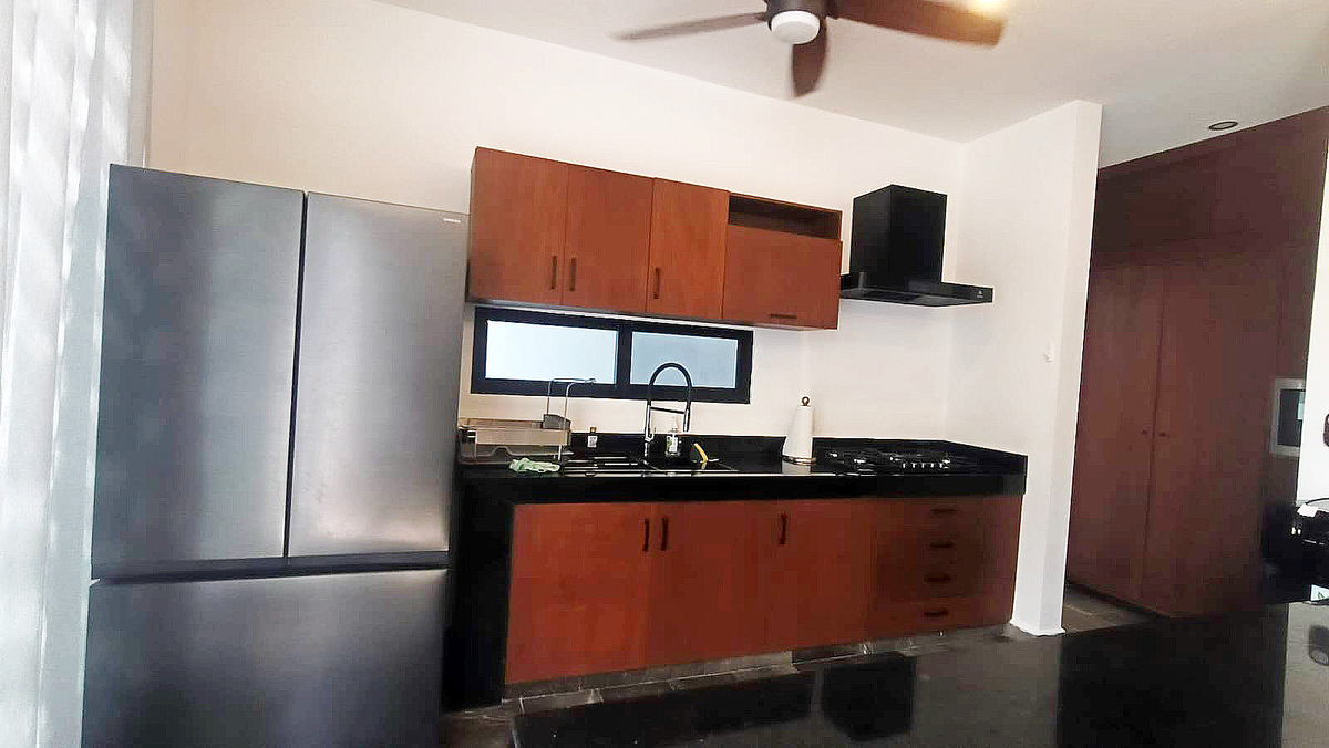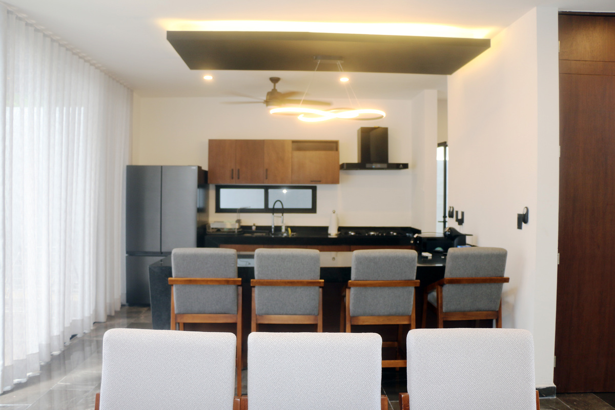 La cocina es integral y equipada con refrigerador, parrilla de gas, enfriador de agua con garrafón escondido, microondas, isla desayunadora amplia con barra de granito, con gabinetes inferiores, 4 sillas altas de madera, tapizadas en tela, área de despensa amplia y ventilador con luz.
