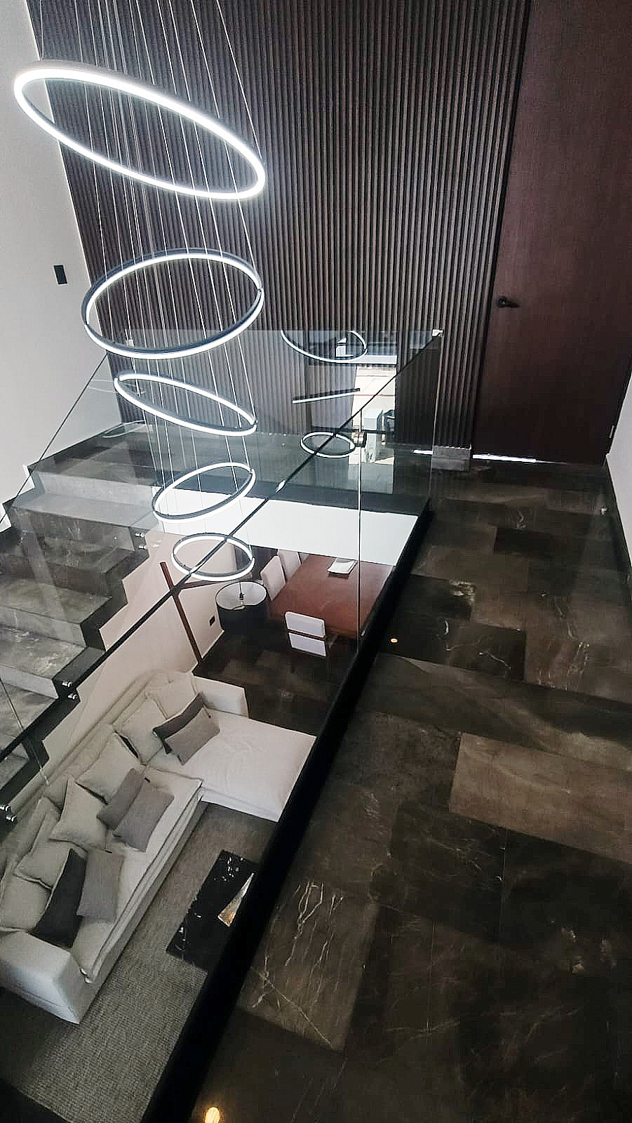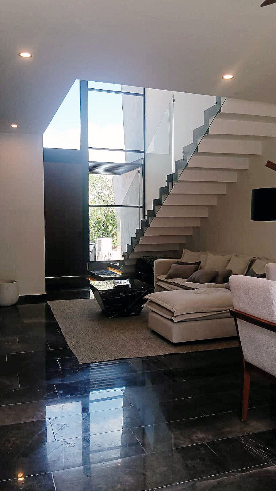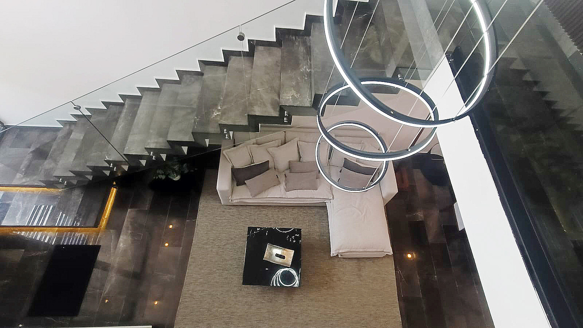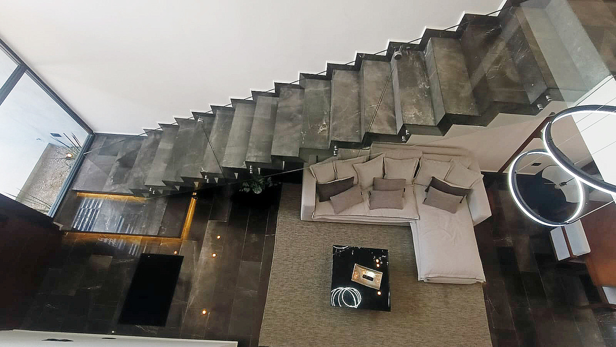 Las escaleras son amplias, forradas de mármol y cuentan con barandal de vidrio templado con techo de doble altura.