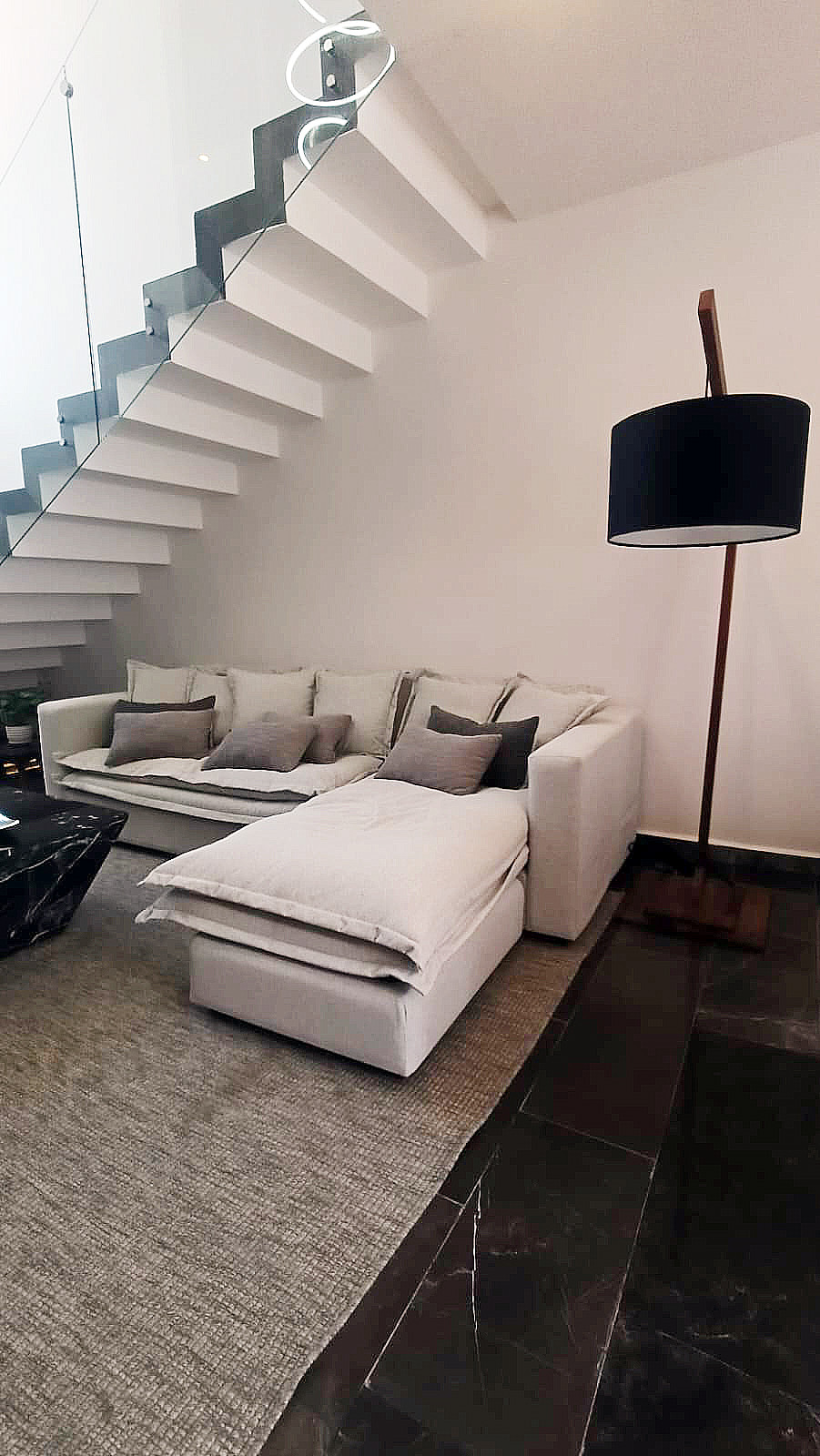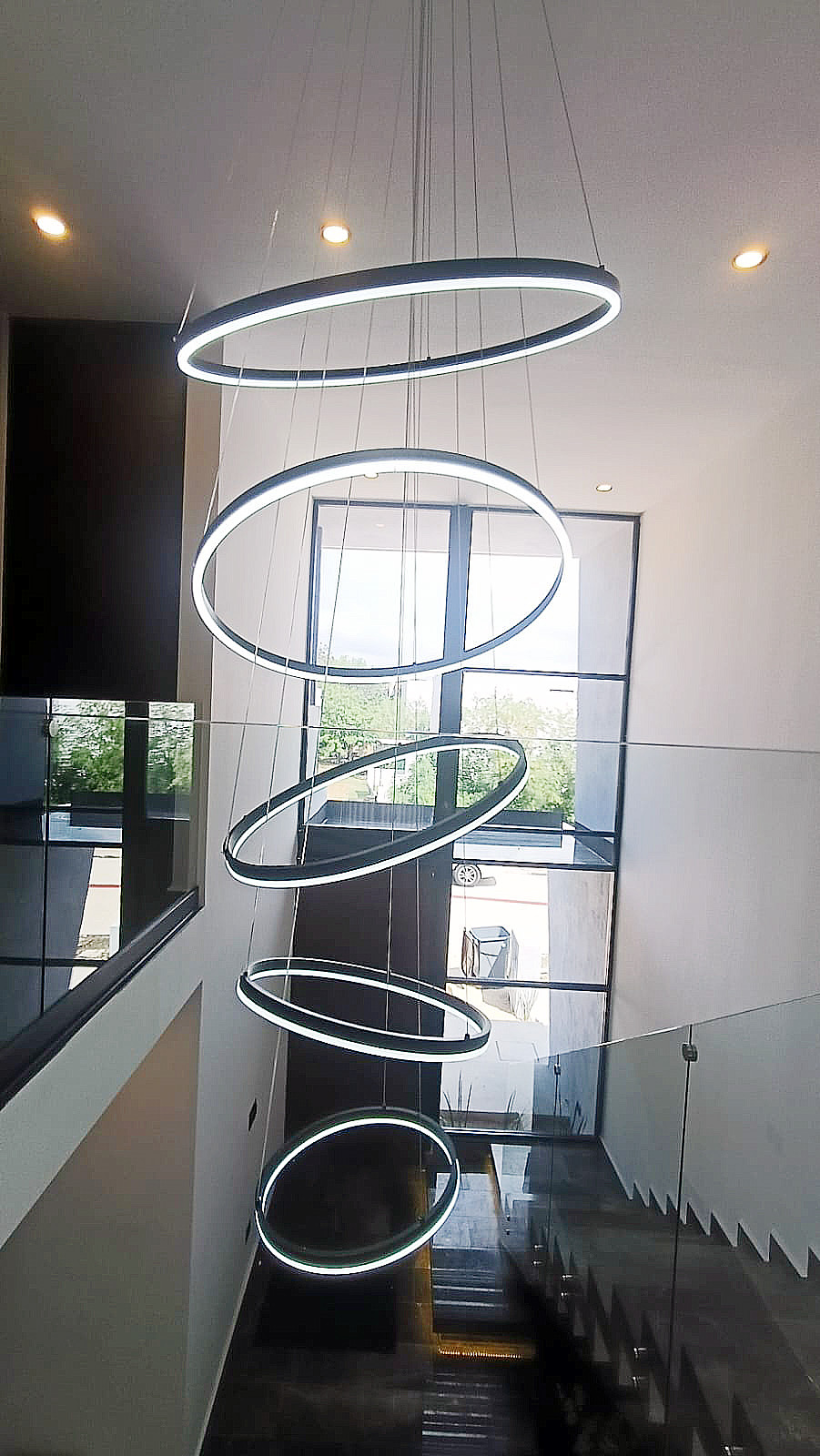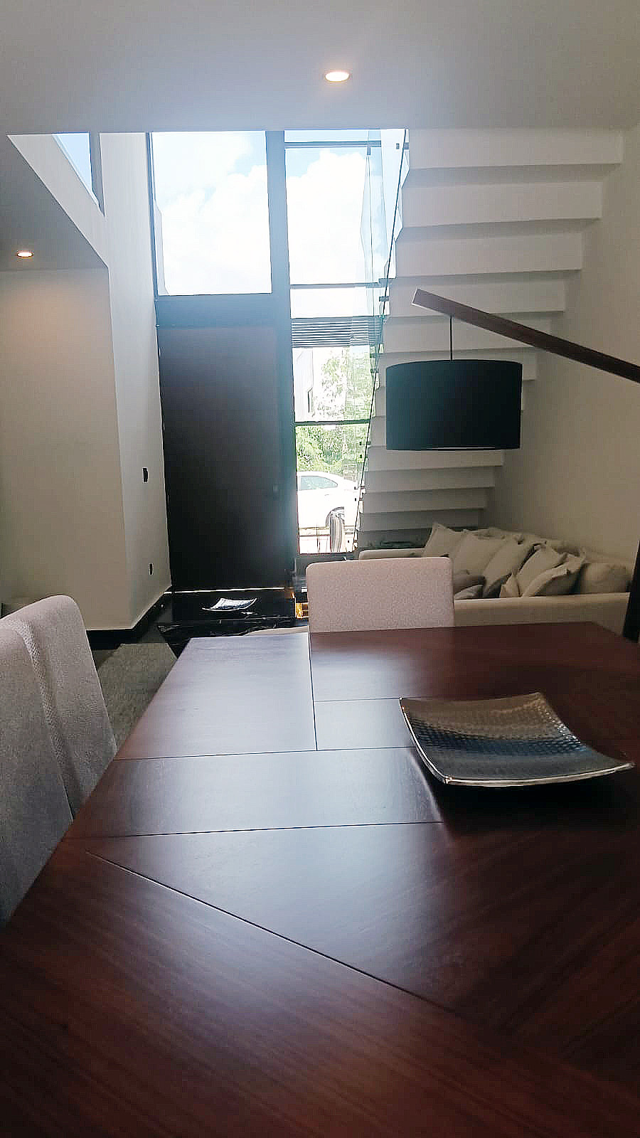 Las escaleras son amplias, forradas de mármol y cuentan con barandal de vidrio templado con techo de doble altura.