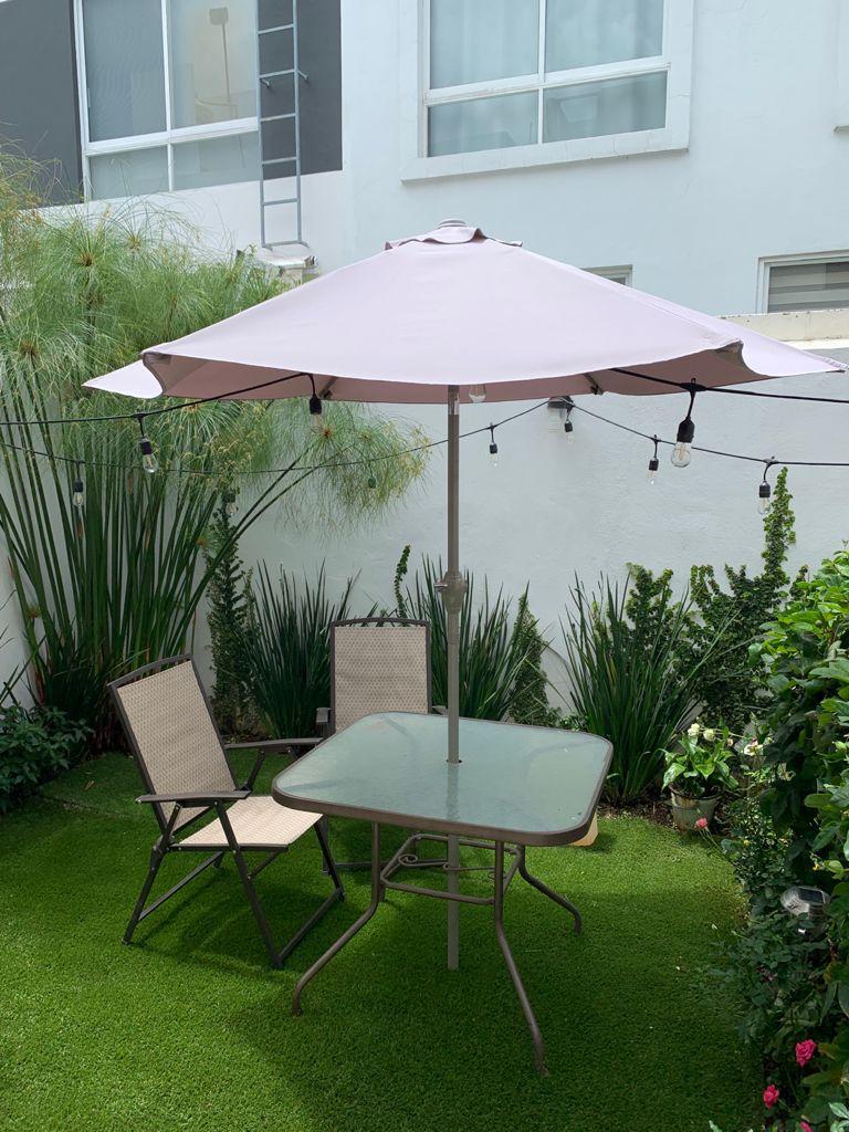 Patio trasero con mesita de jardín y sombrilla