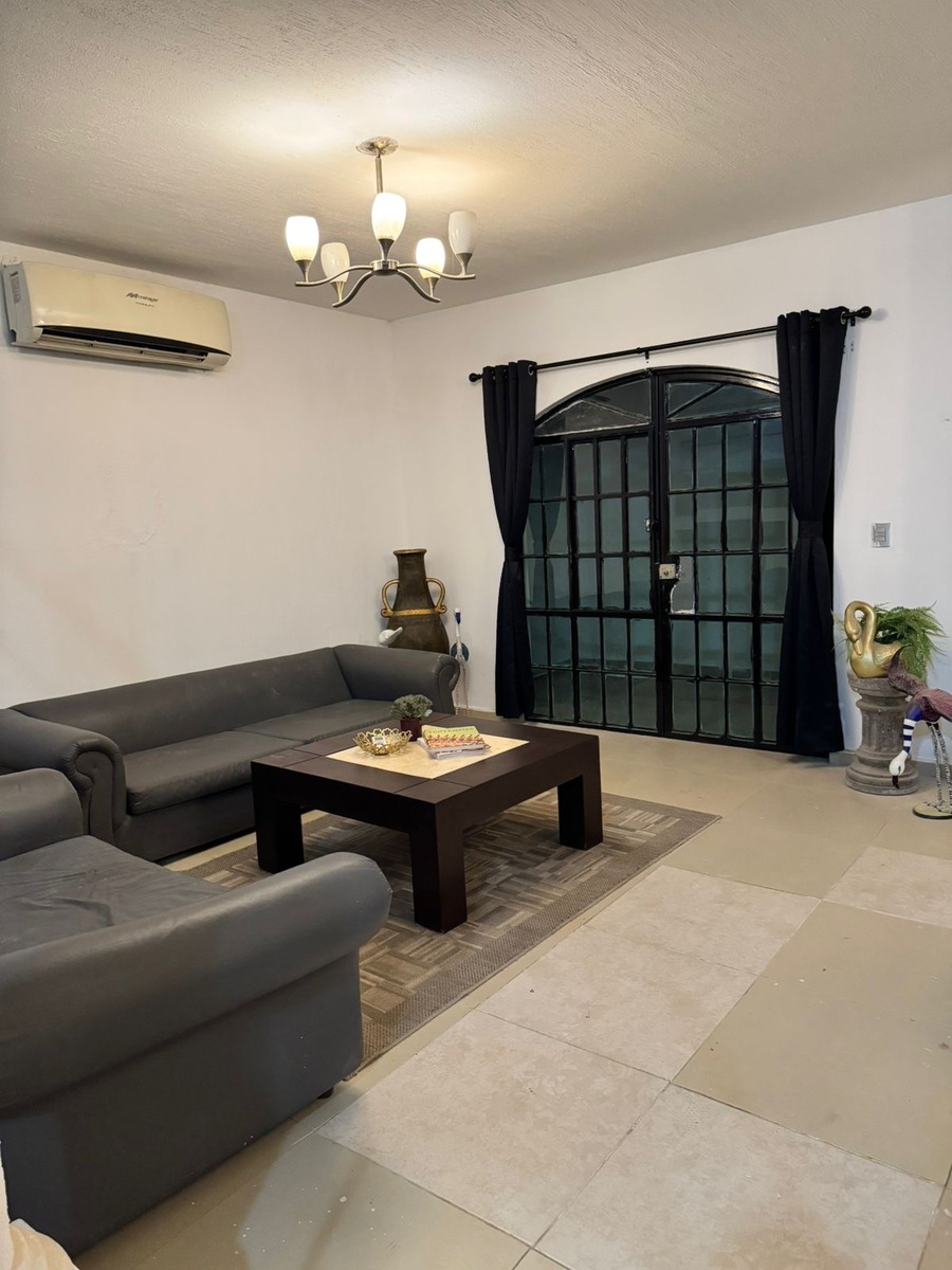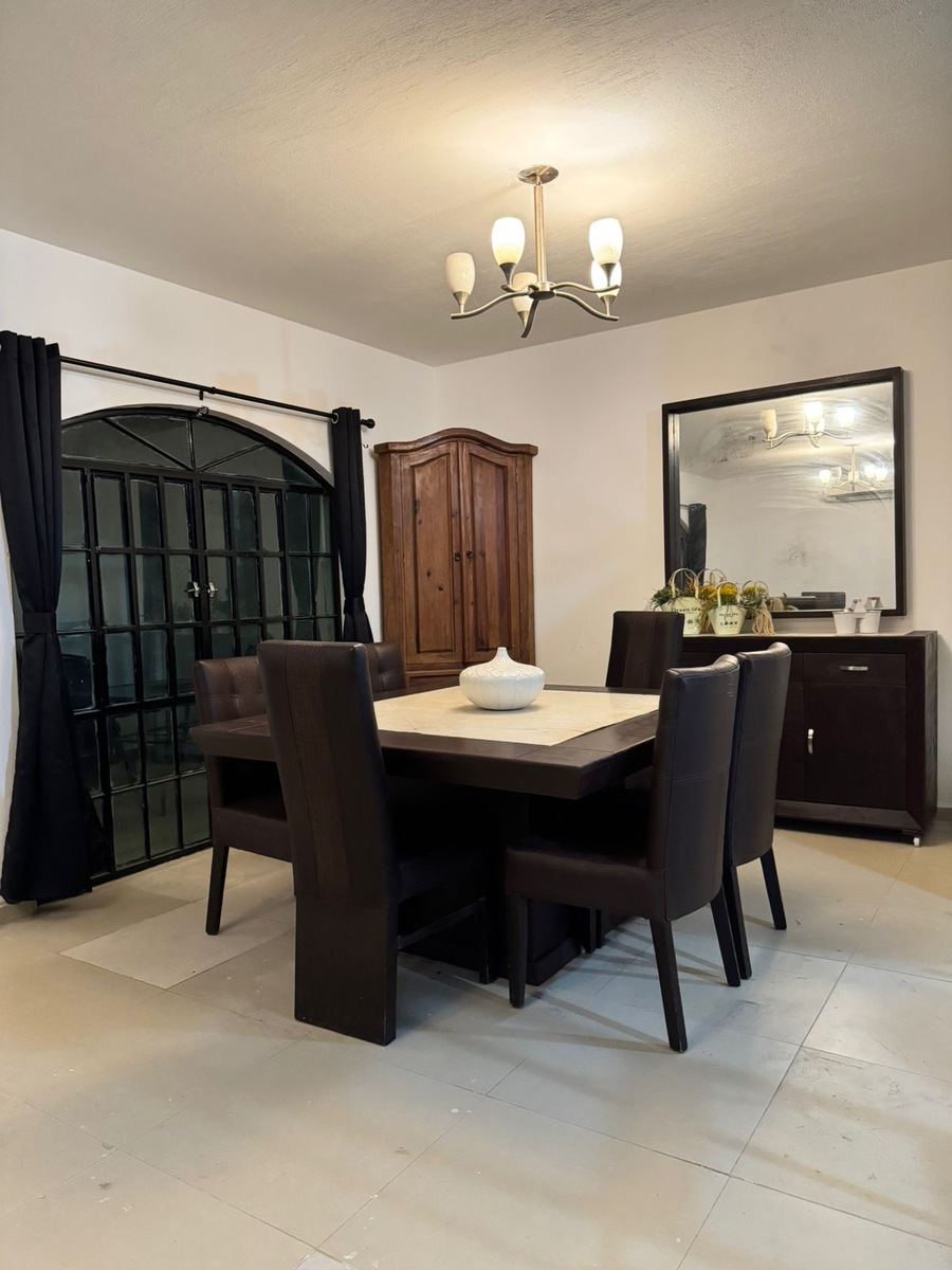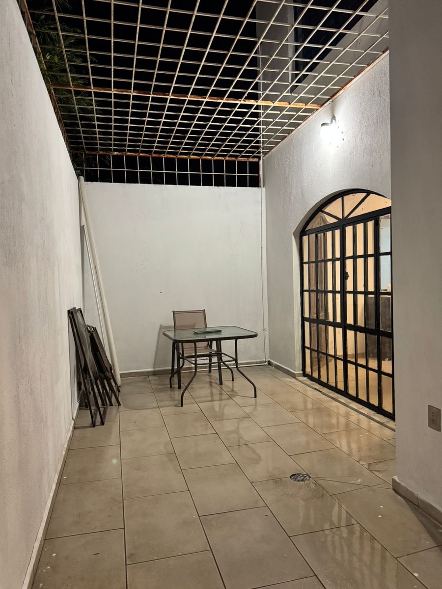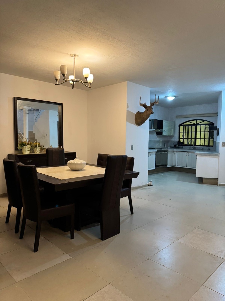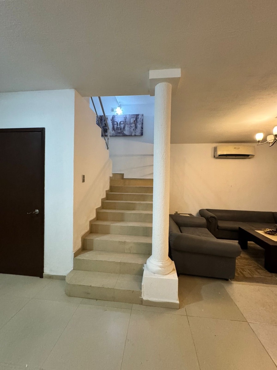 PB: cochera para 2 autos techados, terraza, sala y comedor para 6 personas, cocina equipada con refrigerador estufa y microondas, medio baño para visitas y cuarta recámara o estudio con cama matrimonial.