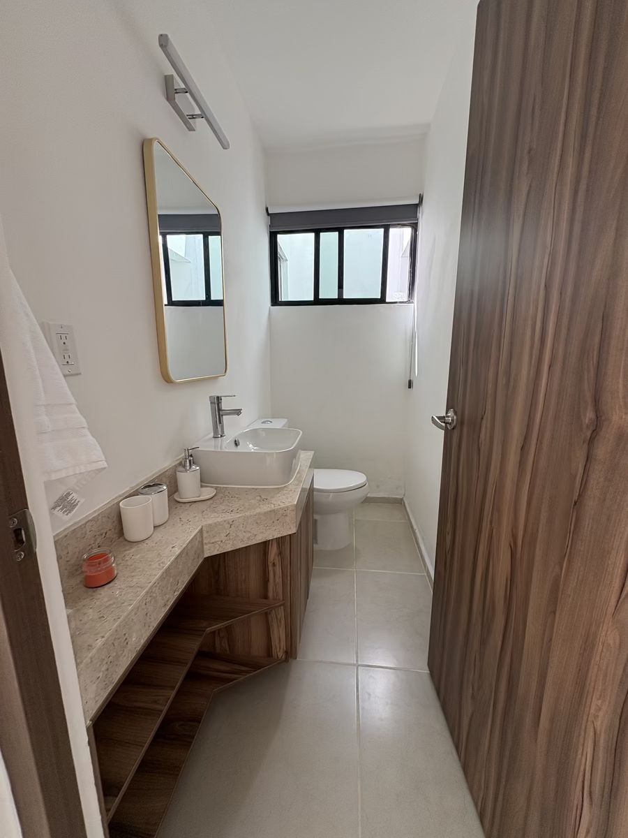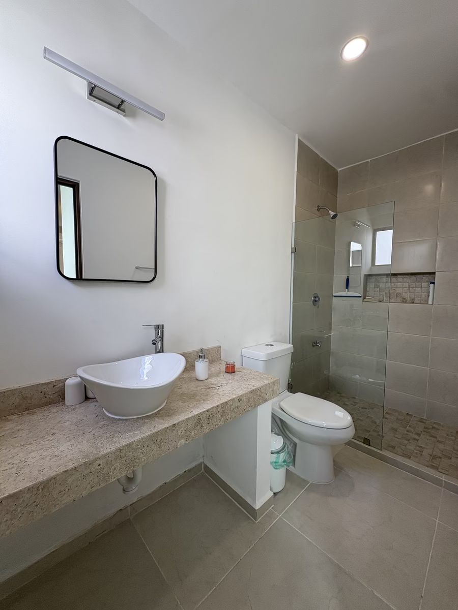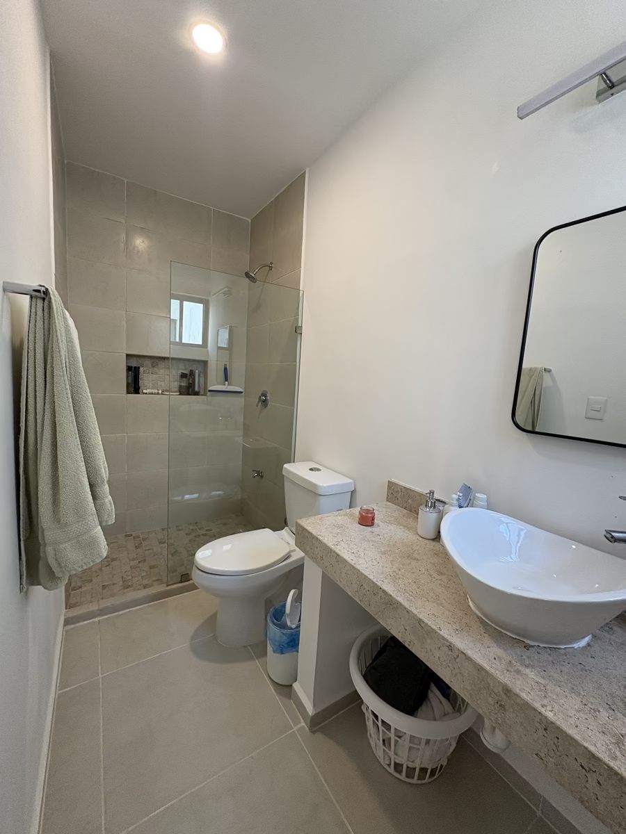 Bathrooms with fixed tempered glass partition and mirrors.Casa en RENTA amueblada, equipada y decorada de dos recámaras, 2 baños y medio en Bosques de Cholul.