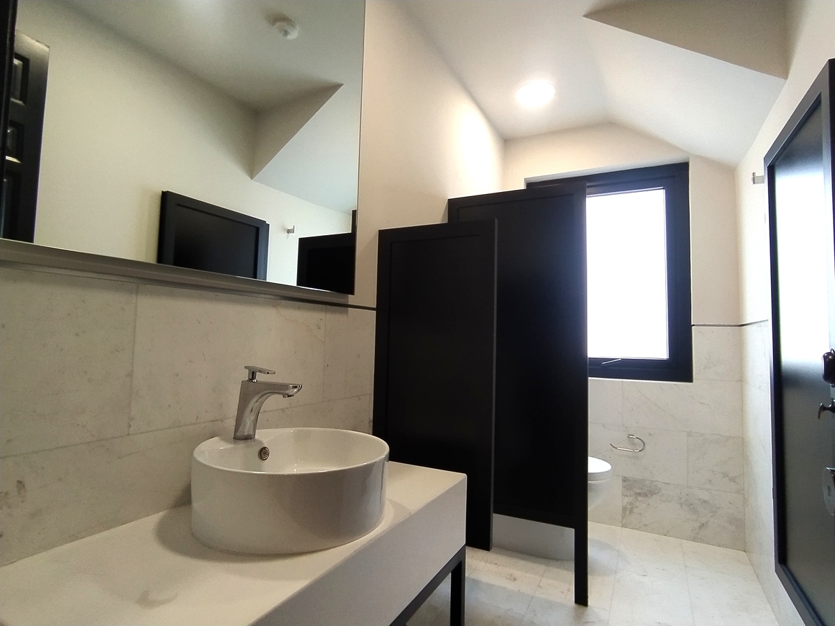 * Baños con pisos y medios muros en mármol Kiknos color blanco.