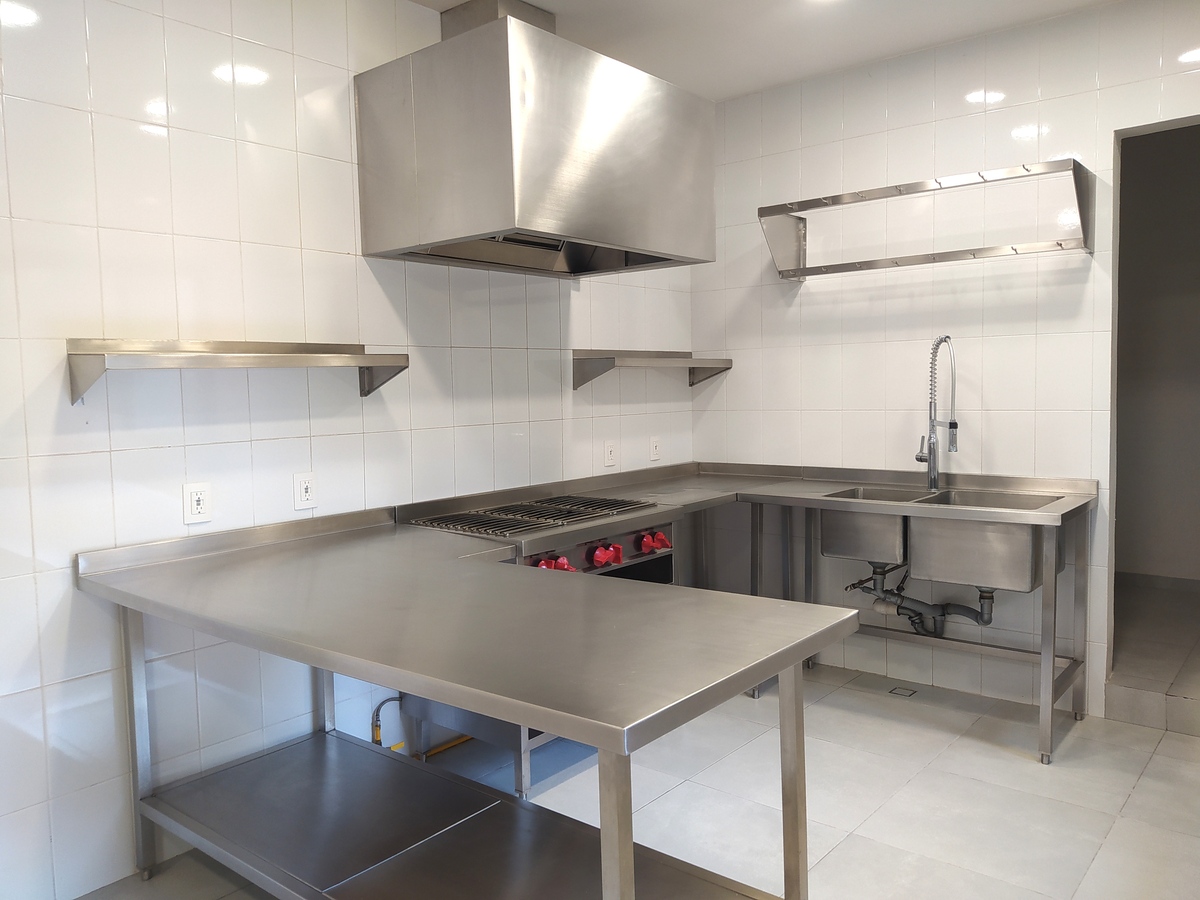 * Cocina con pisos y muros de loseta cerámica Interceramic y mobiliario en acero inoxidable.
