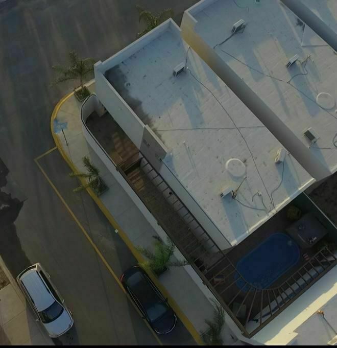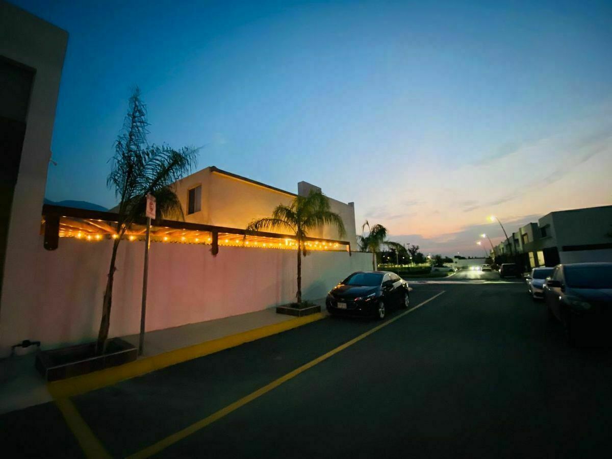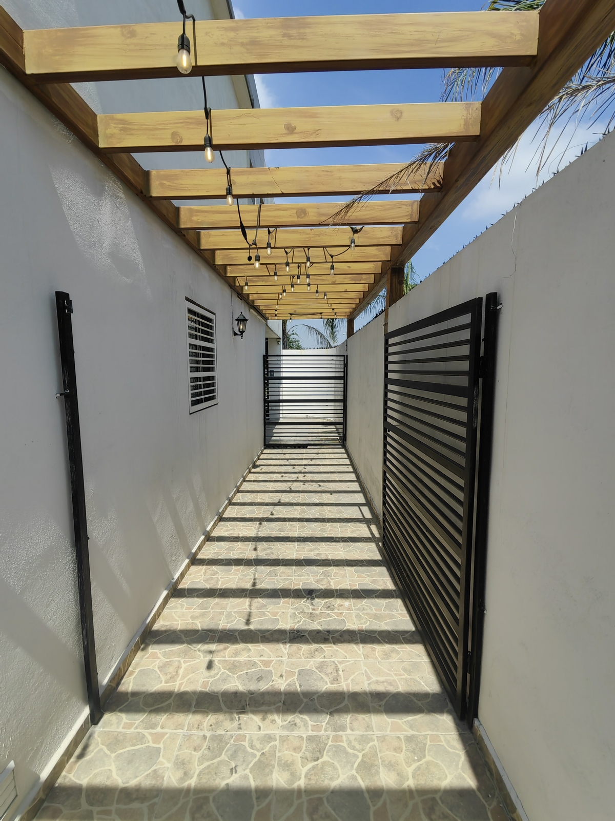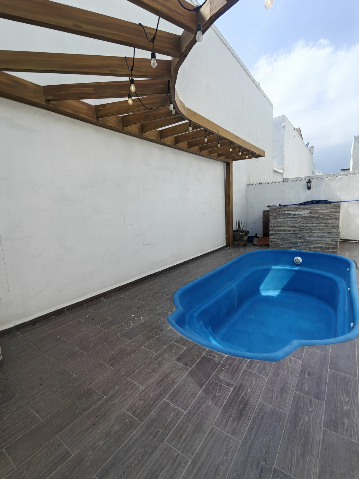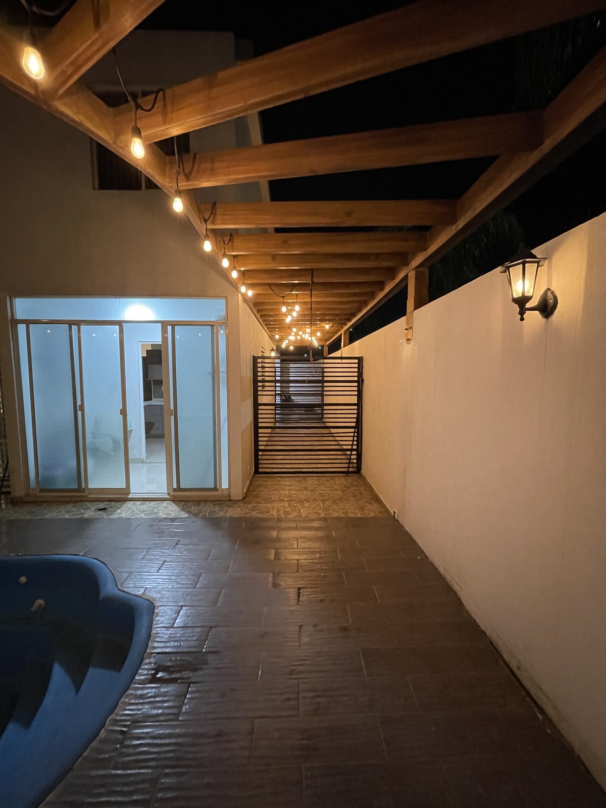 El área exterior de la propiedad, cuenta con una magnífica área de 🏊🏻♀️ alberca ambientada con un techo pergolado con iluminación cálida.