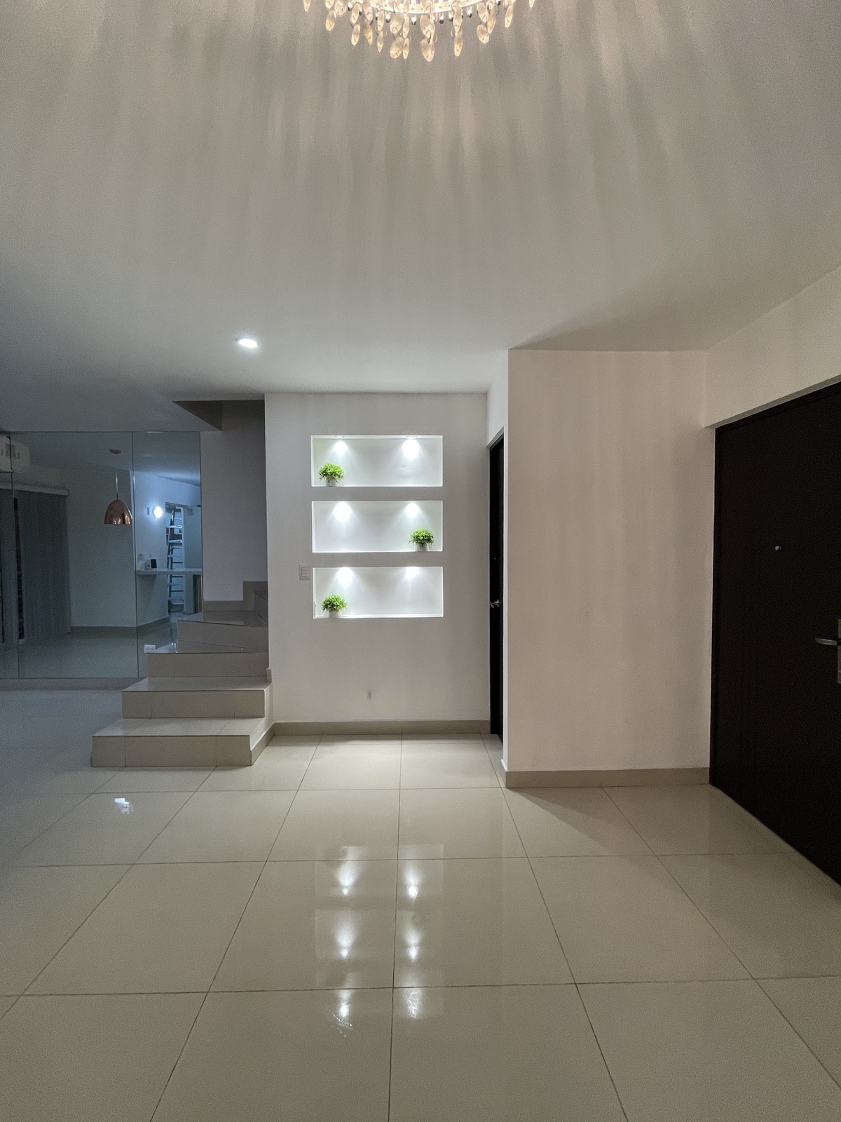 PLANTA BAJA: cochera doble, sala, comedor, cocina con estufa, 1/2 baño para visitas, lavandería, pasillo lateral amplio con protectores, patio, alberca con Pérgola y fuente.