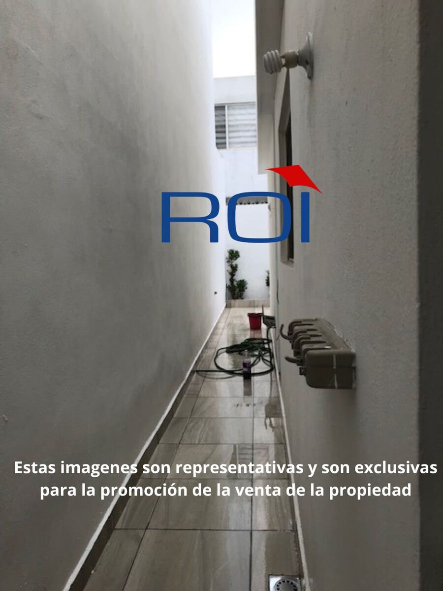 Tiene sala, comedor, cocina, medio baño de visitas, lavandería, bodega debajo de la escalera, pasillo lateral y patio trasero, cochera para dos autos con portón eléctrico. La casa tiene en los techos recubrimiento de fomular y 10 cms de concreto para aislar, lo cual ayuda a tener la casa mas fresca y menos consumo de energía.