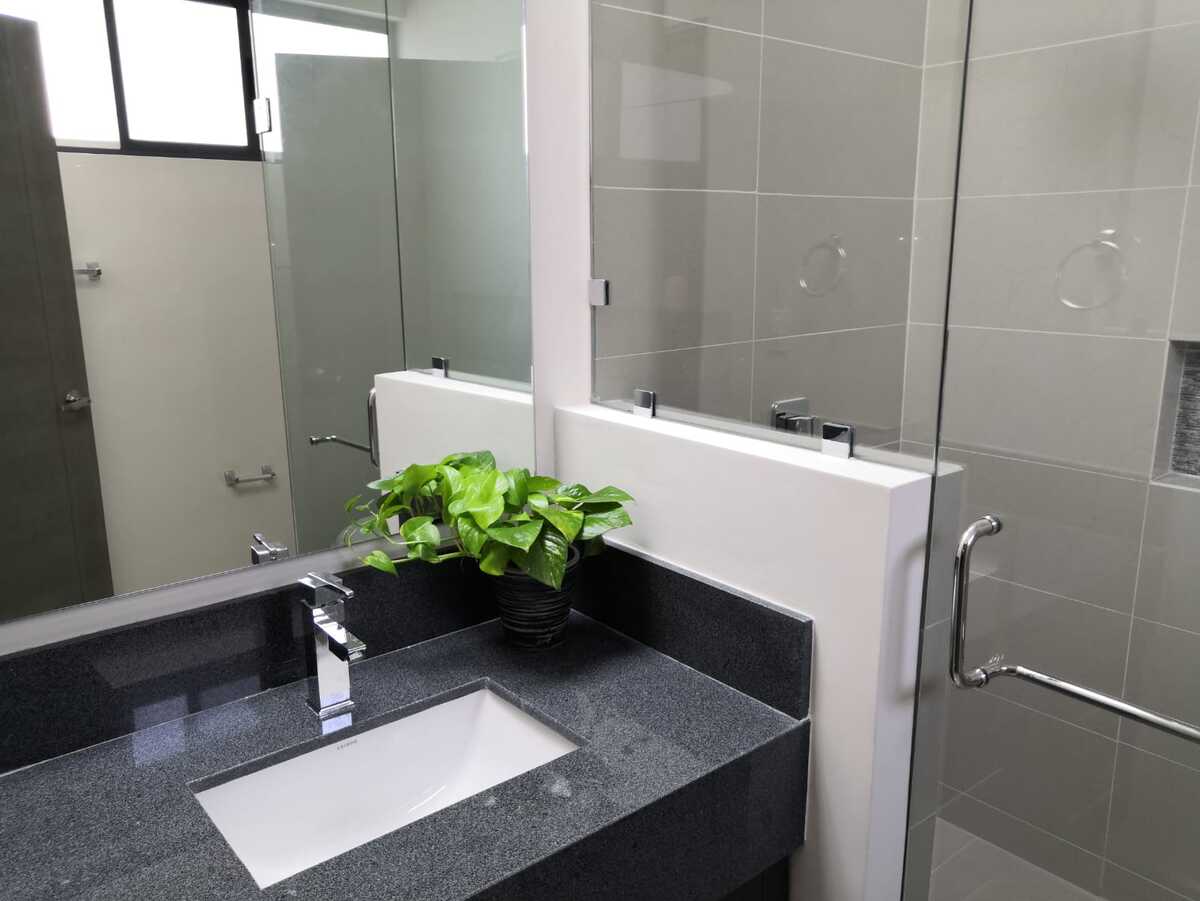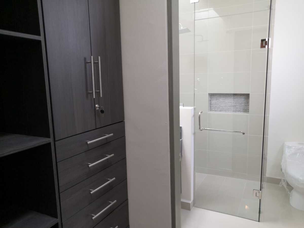 Side stairs with tempered glass railing, 3 bedrooms with their walk-in closet, full bathroom, sink with granite countertop, mirror, lavaneta with MDF furniture, floor-to-ceiling glass partitions, with hardware, toilet and accessories, ceiling fan and inverter mini-split 1.5 tons in the main bedroom, MDF wardrobe with drawers, shelves, luggage racks, and a spacious living area with ceiling fan 5 lights, inverter cold/heat 1.5 tons, 2 secondary bedrooms with 1 ton inverter ceiling fan, MDF wardrobes, sink with granite countertop and MDF drawer, full bathroom, mirror with LED light. Bathroom with floor-to-ceiling glass partitions.