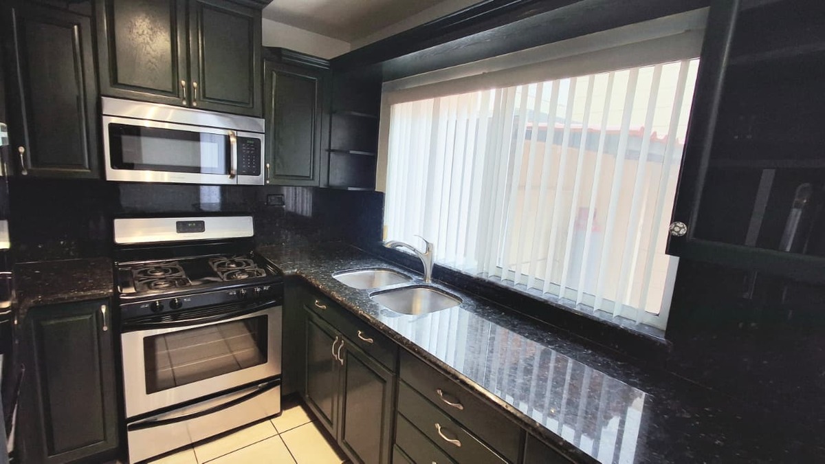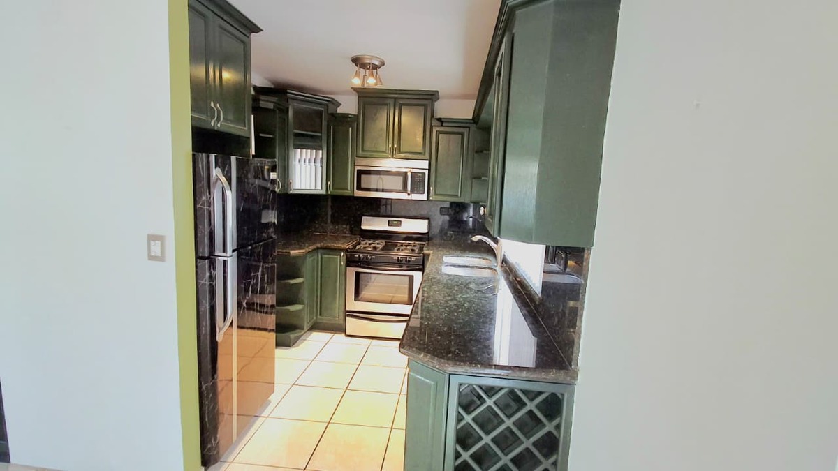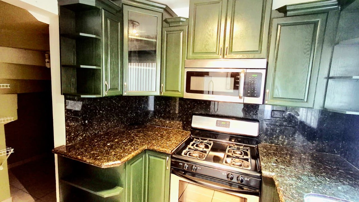 Cocina equipada con cubierta de granito, estufa, refrigerador, campana y alacena
