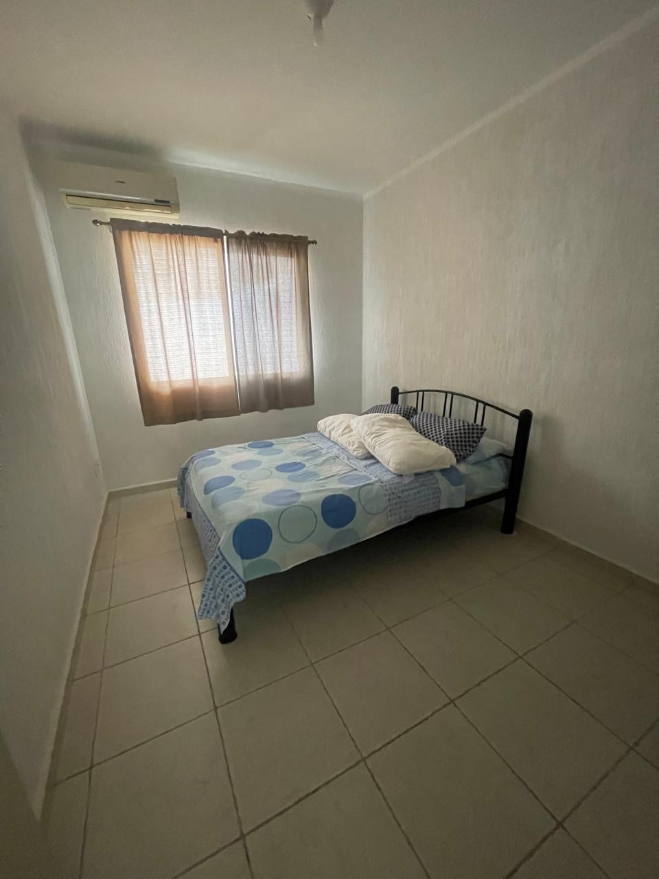 For rent furnished, it has air conditioning in bedrooms and living-dining room, fans, queen bed and king-size bed, living-dining room furniture, two 35-inch screens, stove, refrigerator, microwave, various kitchen utensils.