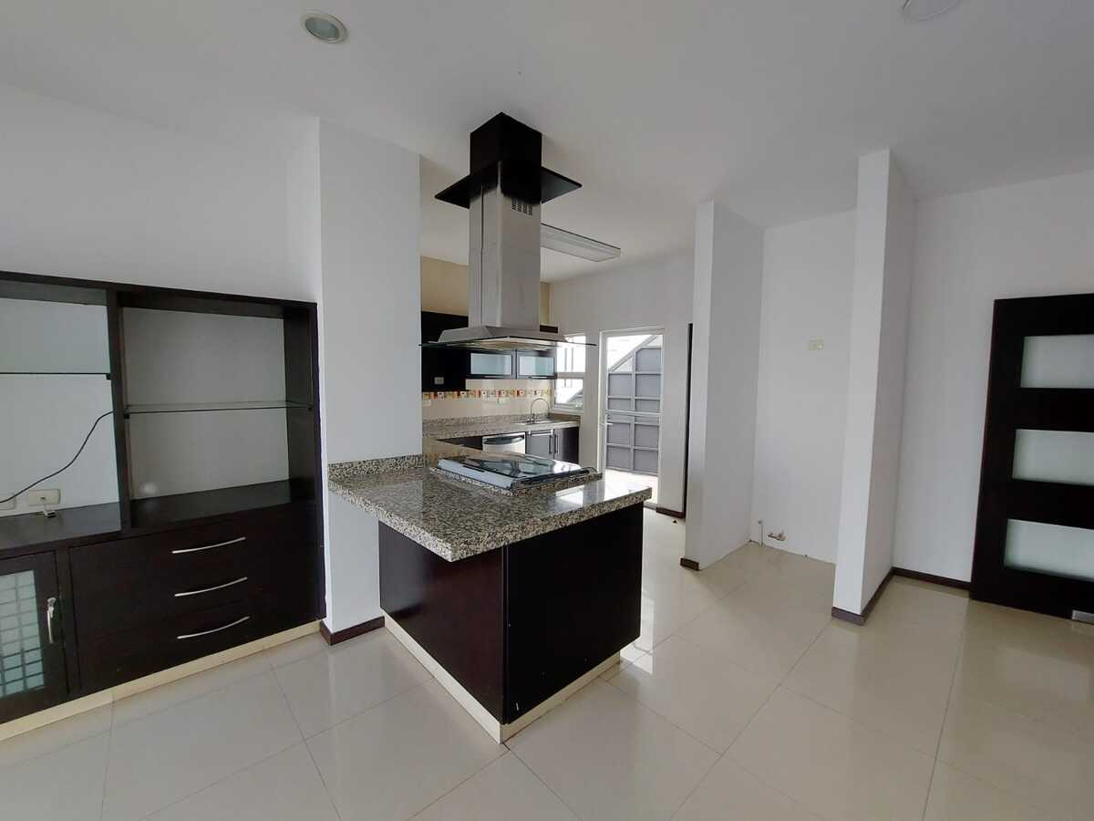 It has an electric gate, covered parking for 3 cars, storage room, double-height entrance, living-dining room, breakfast area, integral kitchen with island and granite bar, pantry, bedroom on the ground floor with closet or study, garden, laundry area that connects to the second floor, half bathroom.