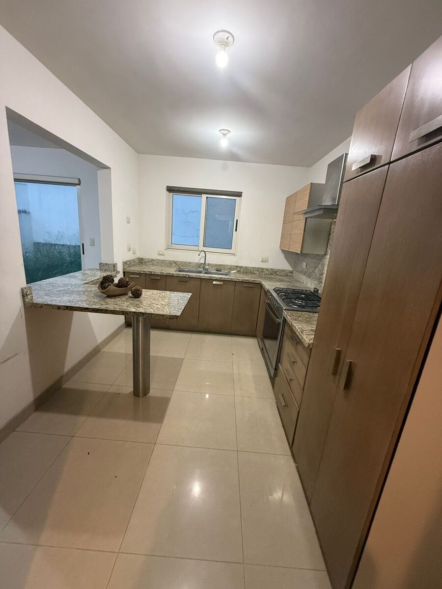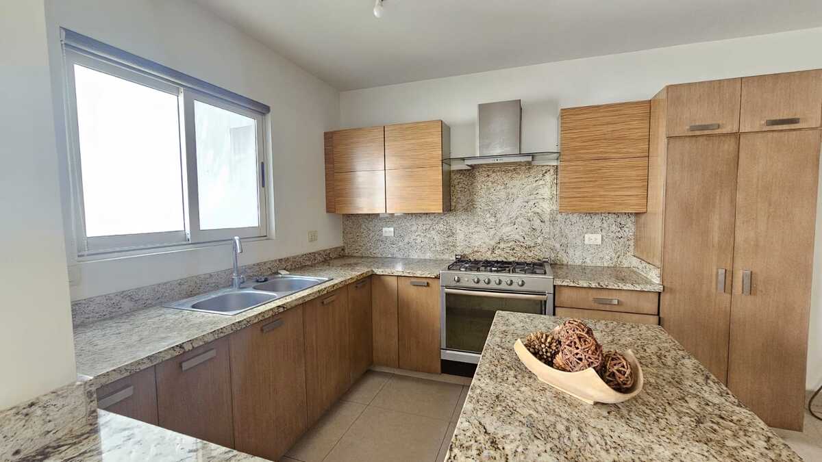 En planta baja cuenta con medio baño de visitas, sala y comedor con espacios muy amplios, cocina integral equipada con estufa, campana y barra desayunadora, cuarto de lavandería, cuarto de servicio con baño completo, pasillo lateral con reja, patio con área de jardín y cochera techada para 2 vehículos.