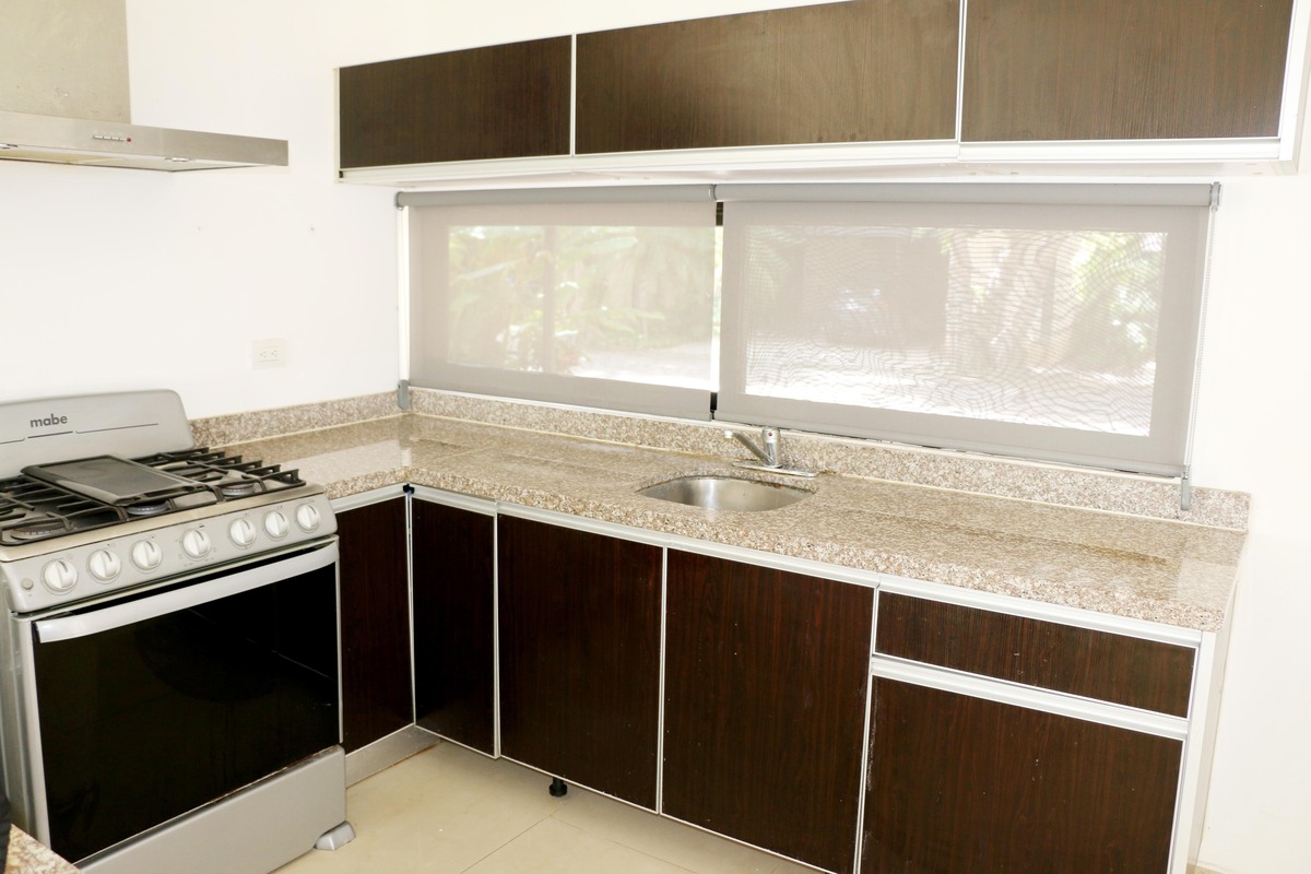 La cocina esta vestida y equipada con estufa, campana estractora y barra desayunadora.