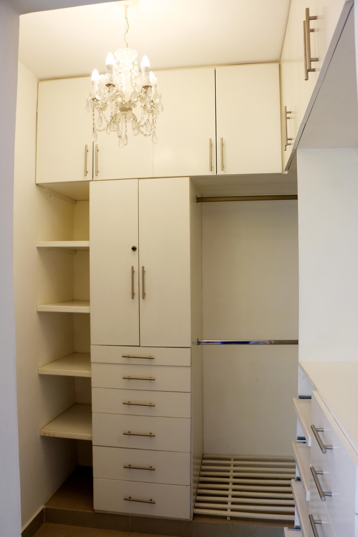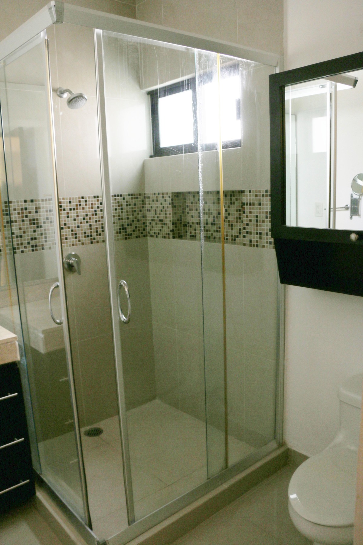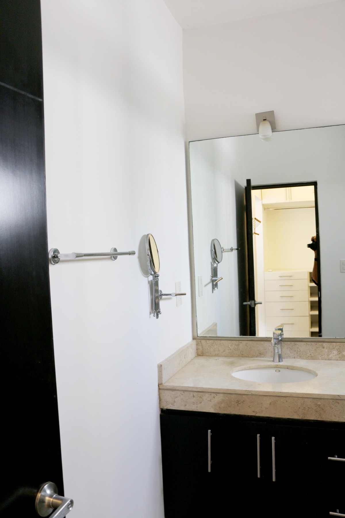 Recámara principal con aire acondicionado, cortinas black out, ventilador, vestidor y baño completo con cancel de vidrio templado y muebles con espejo.