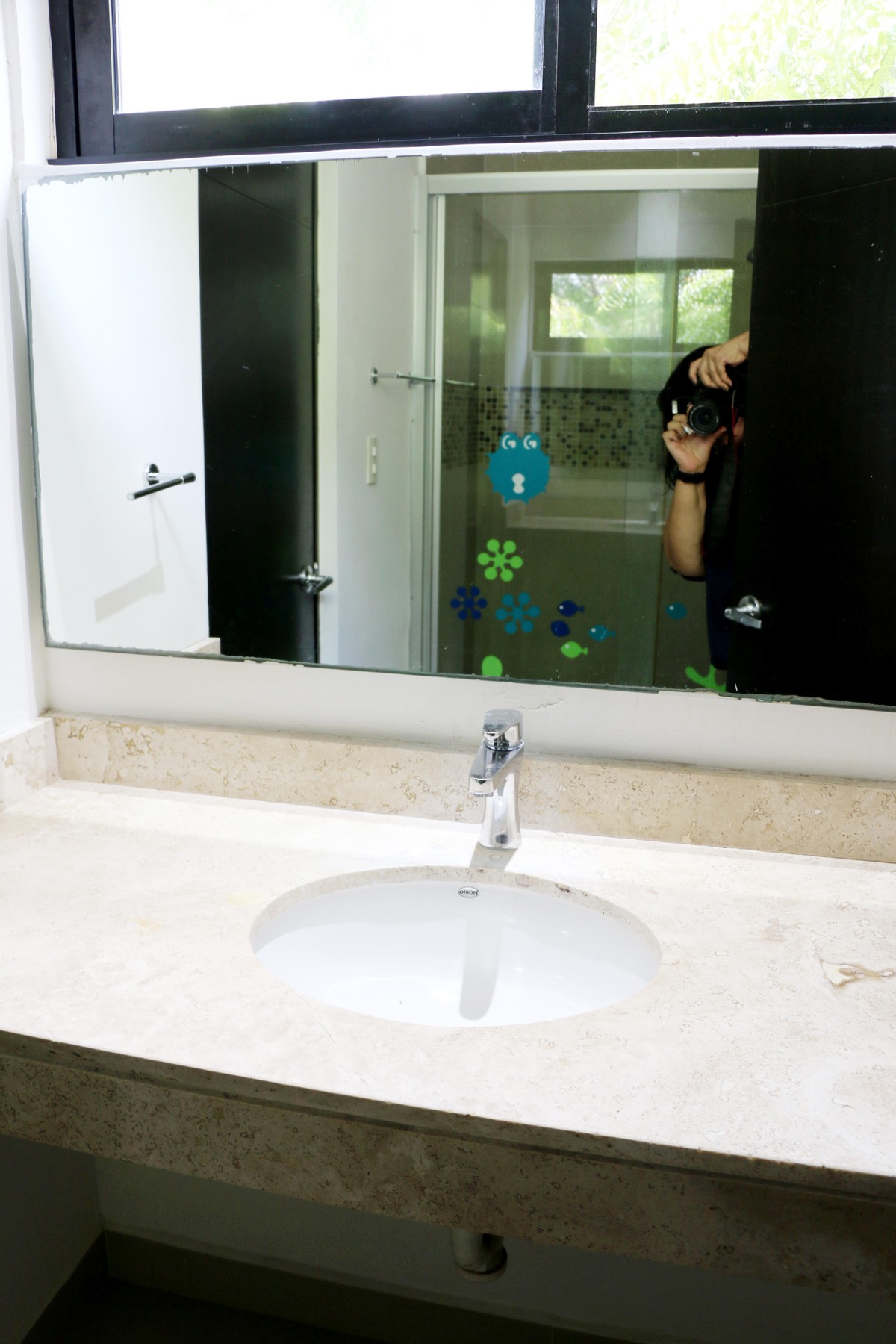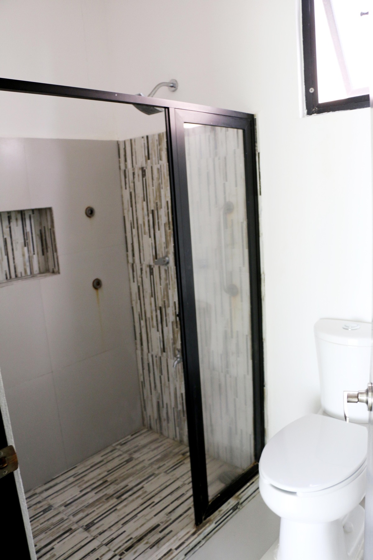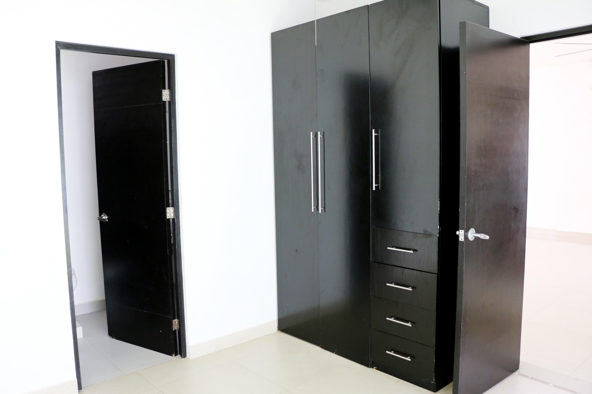 Recámara principal con aire acondicionado, cortinas black out, ventilador, vestidor y baño completo con cancel de vidrio templado y muebles con espejo.