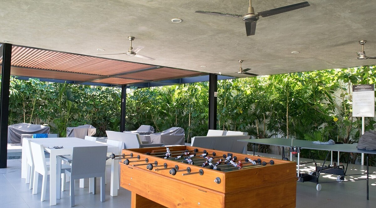 - Área de juegos con mesa de ping-pong y mesa de billar.